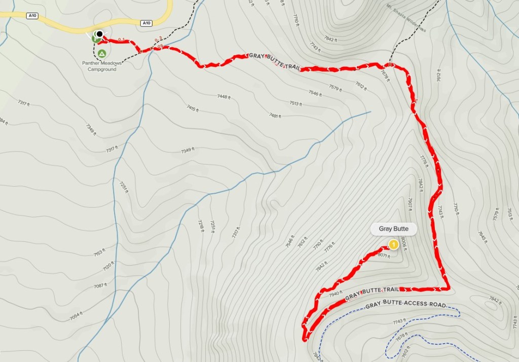 I still had a little time left in the day, but I also wanted to conserve my energy for Mount Shasta tomorrow. I decided to climb 8108 foot Gray Butte, which was nearby and wouldn’t be too long of a hike. I drove about 2 miles east to the Panther Meadow Trailhead and parked there. I began this hike at 4:09pm from 7443 feet above sea level.