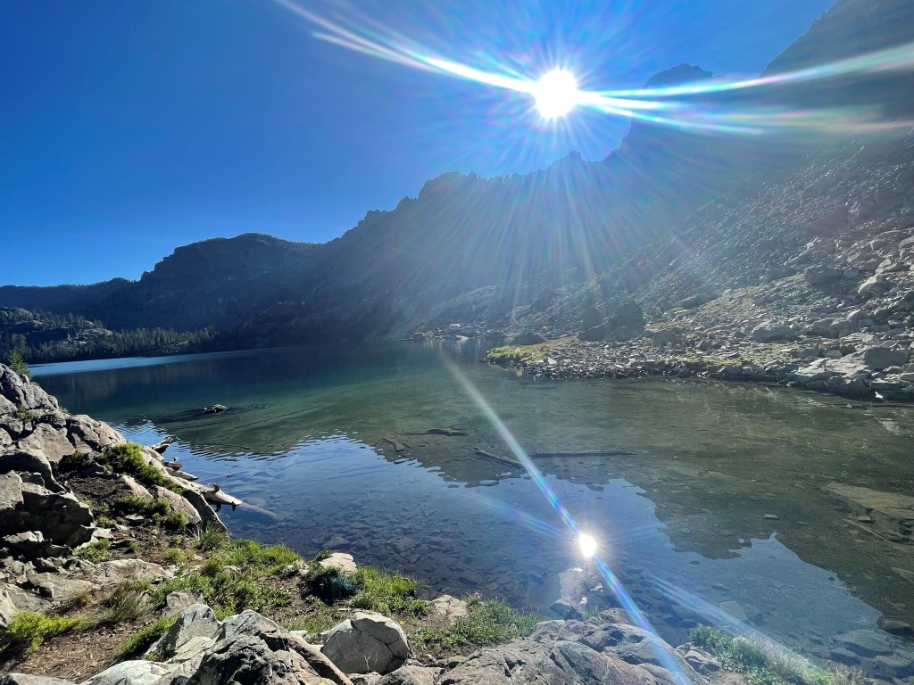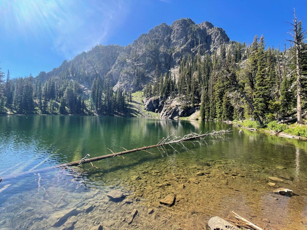 I crossed the talus field and went up and over a small ridge. I descended the other side and reached the Sheep Lake Trail at 4.9 miles. I hiked down to the lake and took a lengthy break near the water.