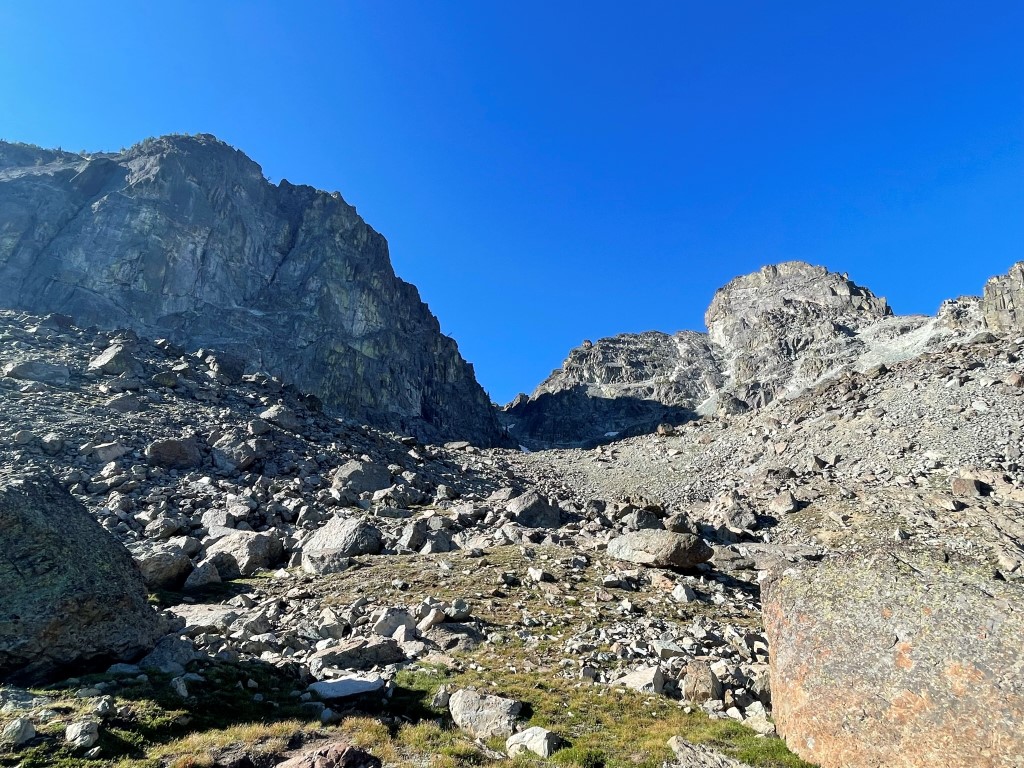 The descent to the saddle required a few class 3 moves as well as a few sections of loose scree. I reached the saddle at 3.3 miles at 8819 feet.