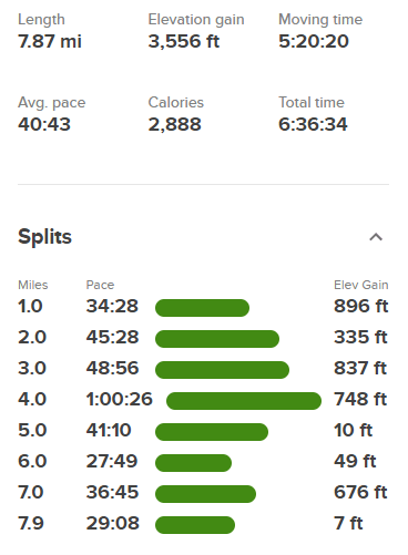 From there it was a short walk back to the car which I reached at 11:25am. Stats for this hike were 7.87 miles, 3556 feet elevation gain, and 6:36:34 total time.
