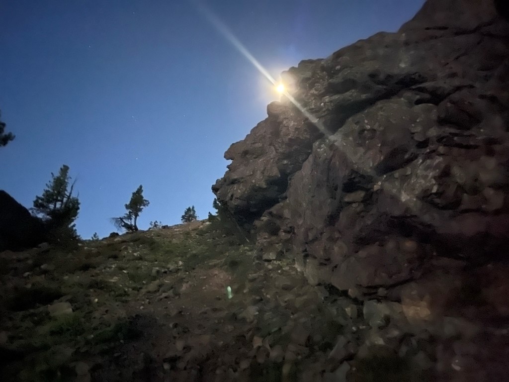 The trail was rugged and difficult to follow in the dark (despite the nearly full moon). At 1.2 miles I left the trail and hiked south along a ridge.