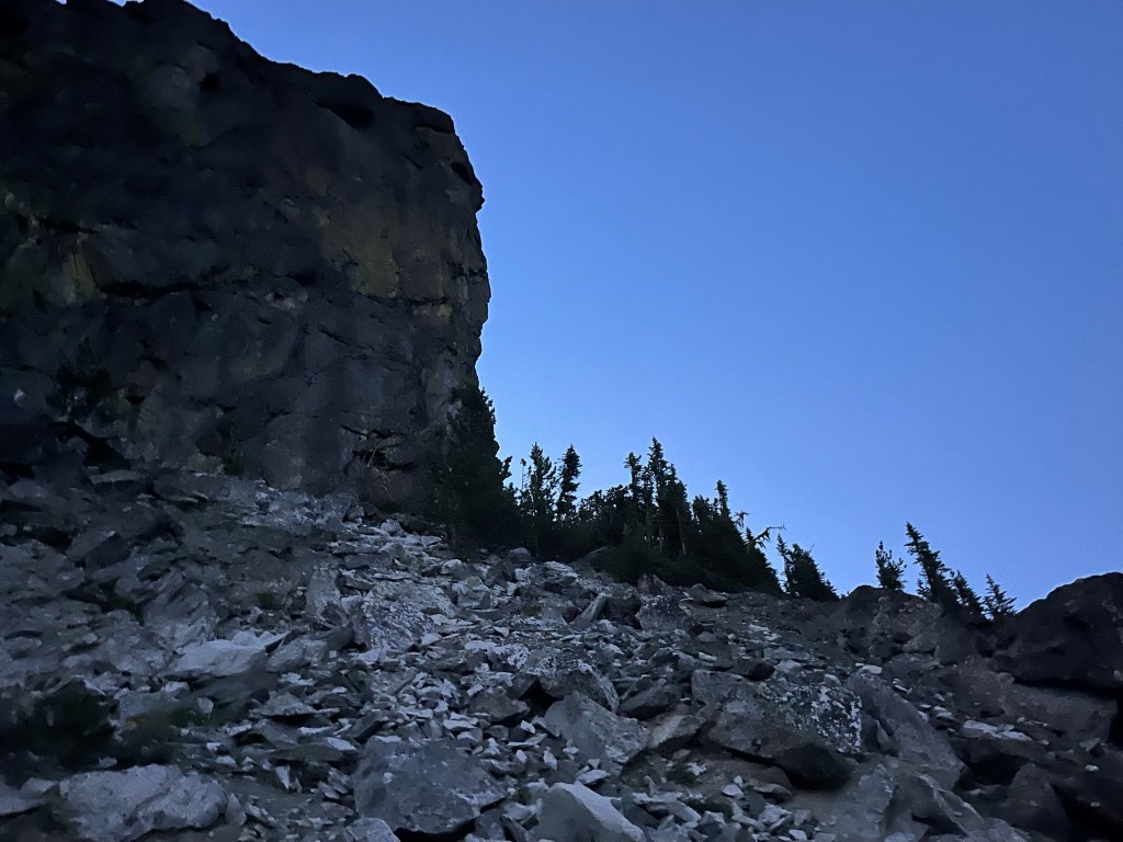 I followed the Sheep Lake Trail through the darkness as it ascended steeply from the campground. I could see the Tower of Babel in the distance.