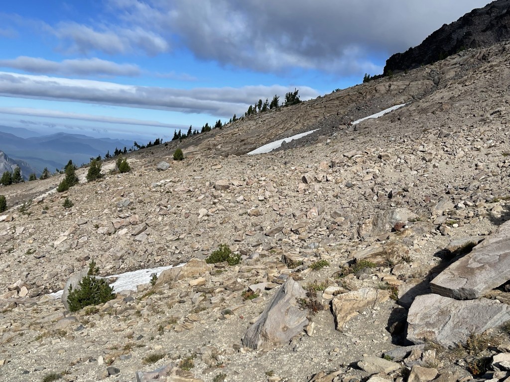 The trail was much easier to descend due to the sandy/gravelly nature of the ridge. I soon reached the crest below Lewis Glacier at 7.5 miles. I passed many hikers still making their way up. I decided to climb a small peak called Lewis Glacier Peak (9017 feet) just south of the glacier.