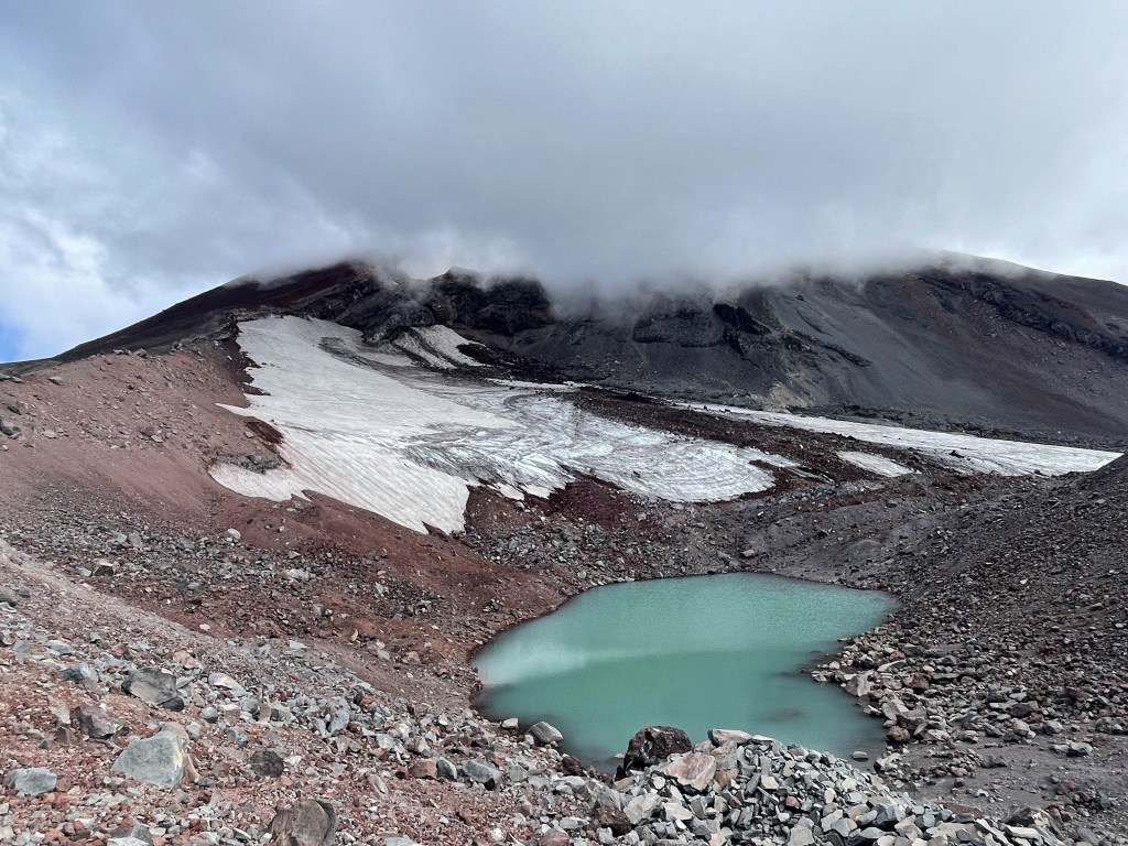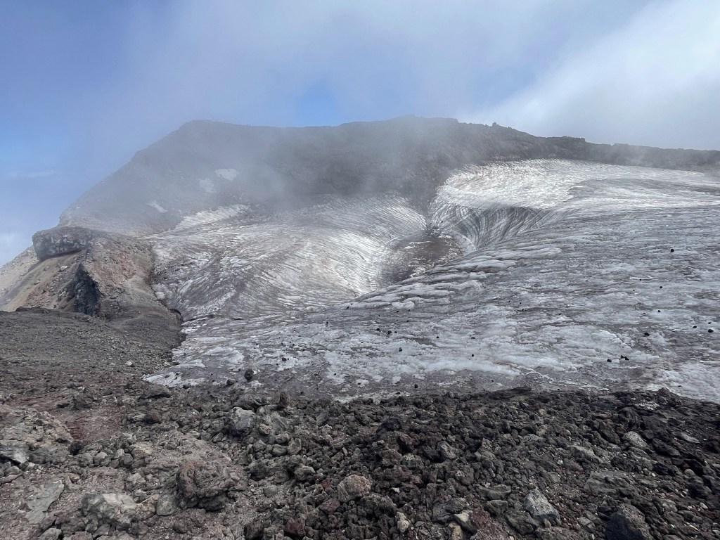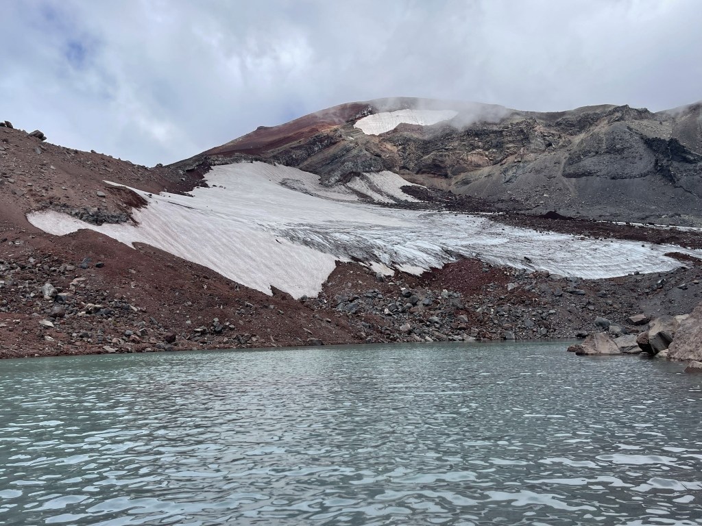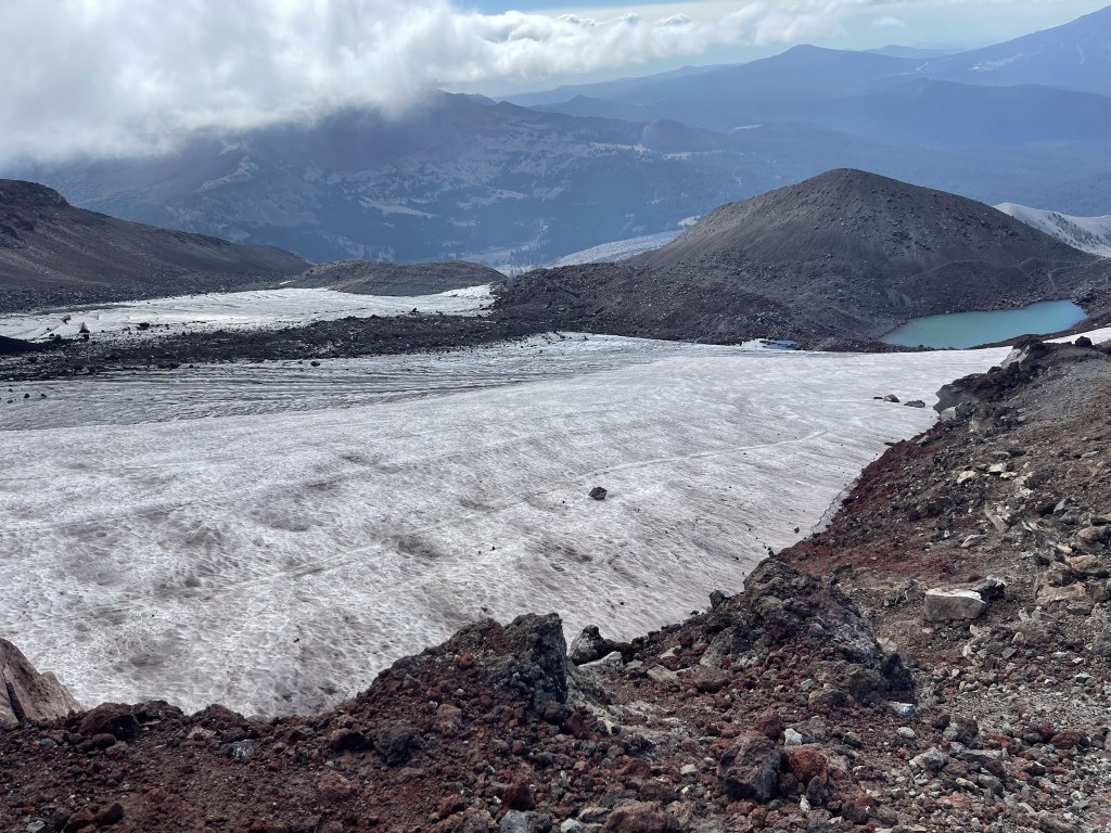 I reached a crest at 4.8 miles at 8800 feet. I had a great view of the Lewis Glacier and Lewis Tarn just below. The upper part of the peak was still hidden by clouds.