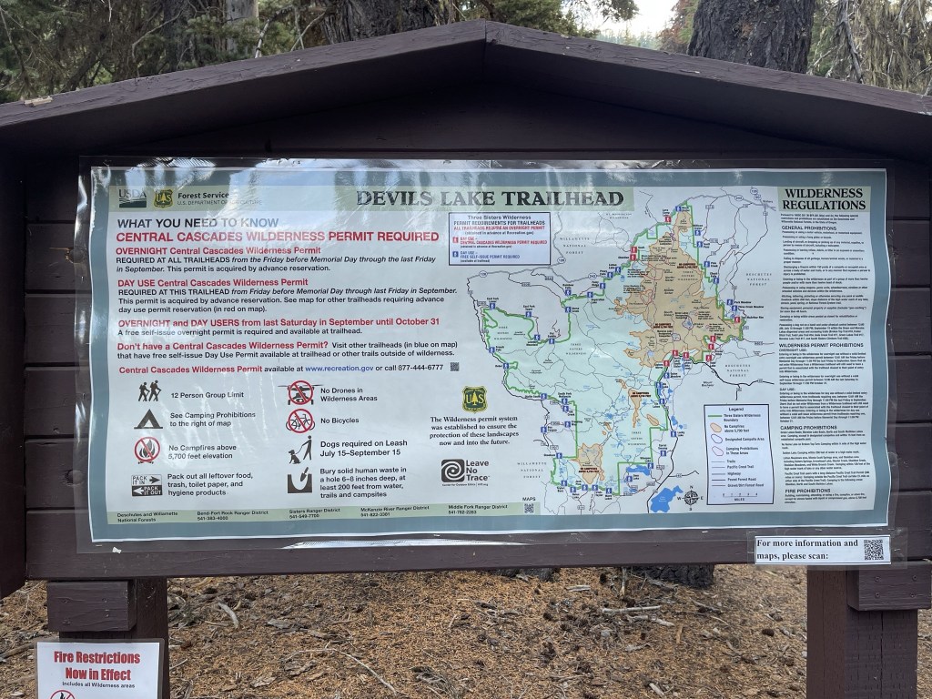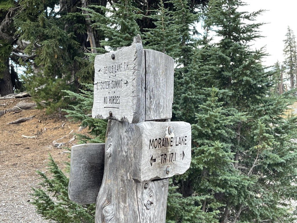 The Three Sisters are a group of 3 volcanoes in Central Oregon that contain the 3rd, 4th, and 5th highest peaks in the state. The tallest of the 3 is South Sister at 10358 feet. It is also the easiest of the 3 to climb, with a popular trail leading all the way to the summit. Due to the popularity of South Sister, a Central Cascades Wilderness Permit is needed to climb the peak. The permits are limited to a quota each day and I think they go pretty fast. They are available 1 week before each date at 7am. I was on recreation.gov at exactly 7am on August 12 to make sure I got one. I camped nearby on Forest Road NF-4025, so I was planning to get an easy start (but I didn’t because it was too cold to get up early). I made the short drive to the Devils Lake Trailhead and began hiking at 7:03am from 5463 feet above sea level.