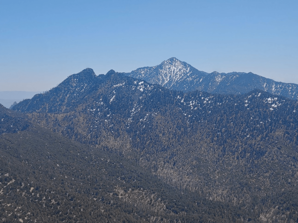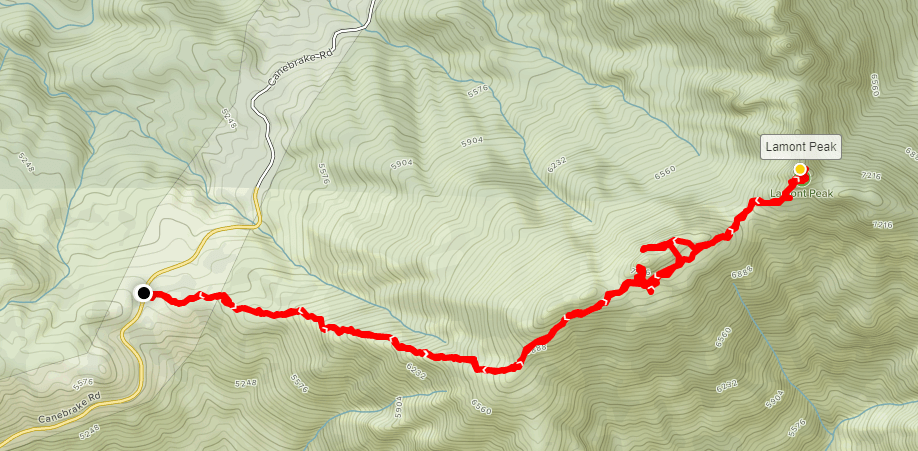 This hike left me very exhausted. I was originally considering climbing another HPS peak nearby called Five Fingers which would be about 3 miles/1500 feet elevation. I probably had enough time in the day for that, but I wanted to conserve my energy for Sunday. I instead took my time packing up the car and having a late lunch/early dinner while enjoying the magnificent scenery at the trailhead. I decided it was one of the cooler places I had camped at in my life. All I had left planned for the day was to drive to the next morning’s trailhead (for Lamont Peak) where I would sleep for the night. I drove back out to Highway 14, which I drove south on for a few miles before turning west (right) onto Highway 178. I drove about 19 miles before turning north (right) onto Chimney Peak Road. This is a different portion of the same road I used to access the PCT for my hike on Friday. It was about 6 miles on well-graded Chimney Peak road to the trailhead for Lamont Peak at 5487 feet. The trailhead has space for 4-5 cars, and any car could make it to this point. I arrived at 6:30pm and enjoyed some reading before falling asleep around 9.