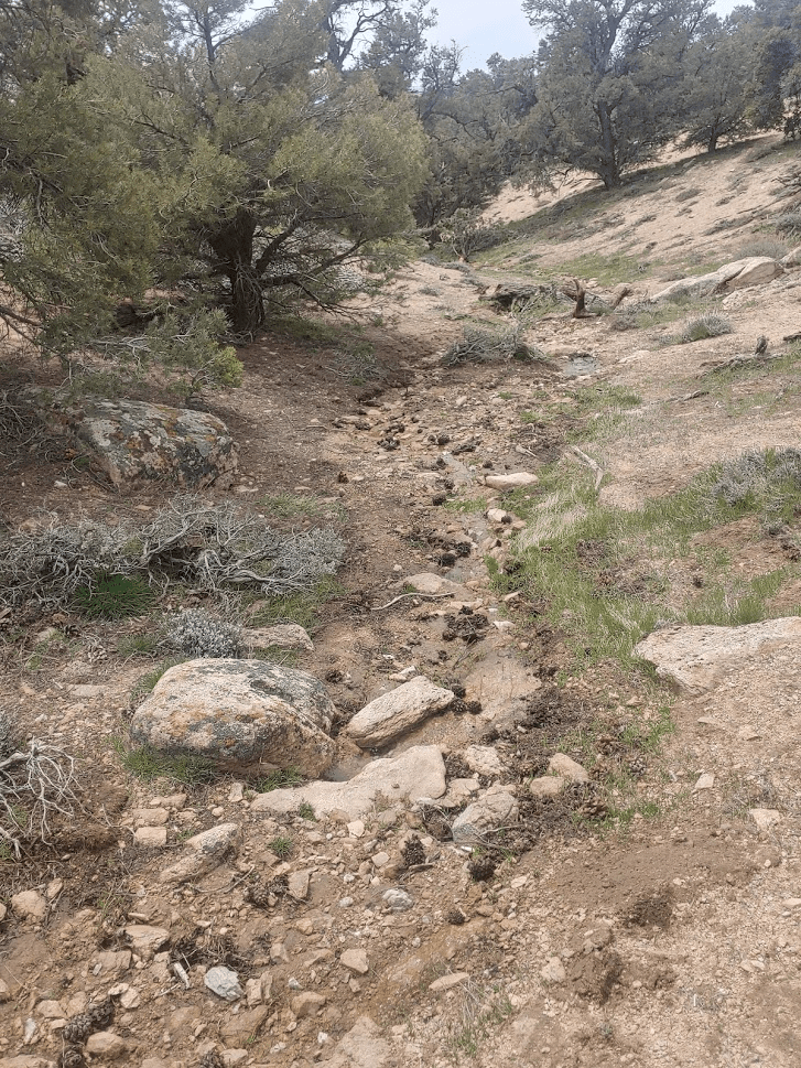 There was water flowing along portions of the gully.