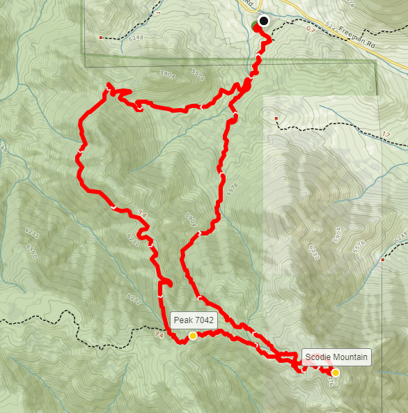 At 4.88 miles, I reached Peak 7042. I was only about 200 feet lower than Scodie, but I still had 1.5 miles to cover.