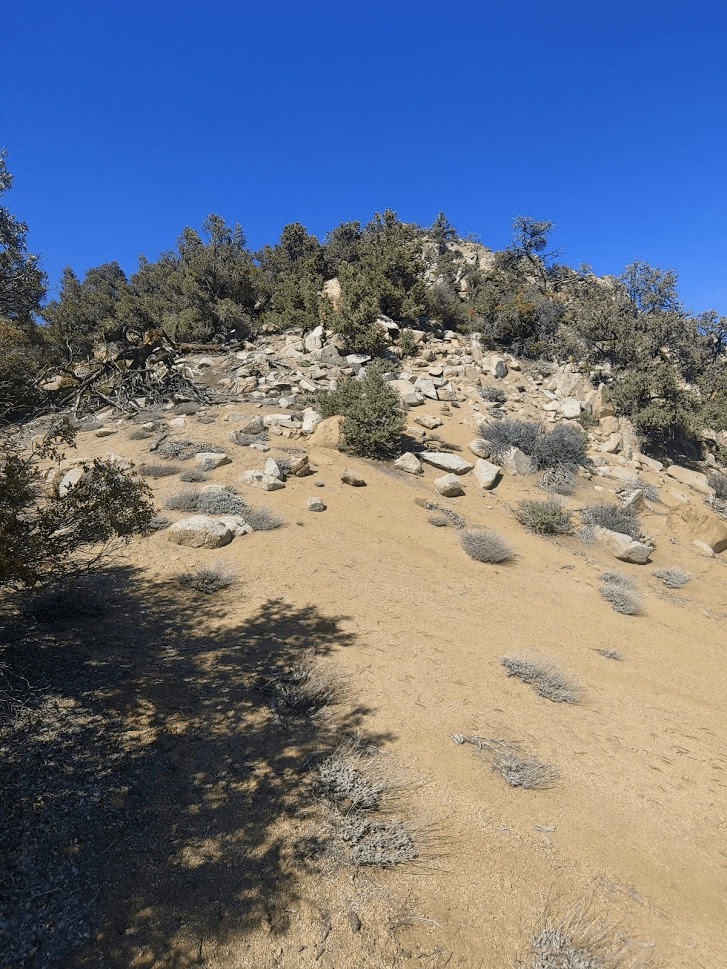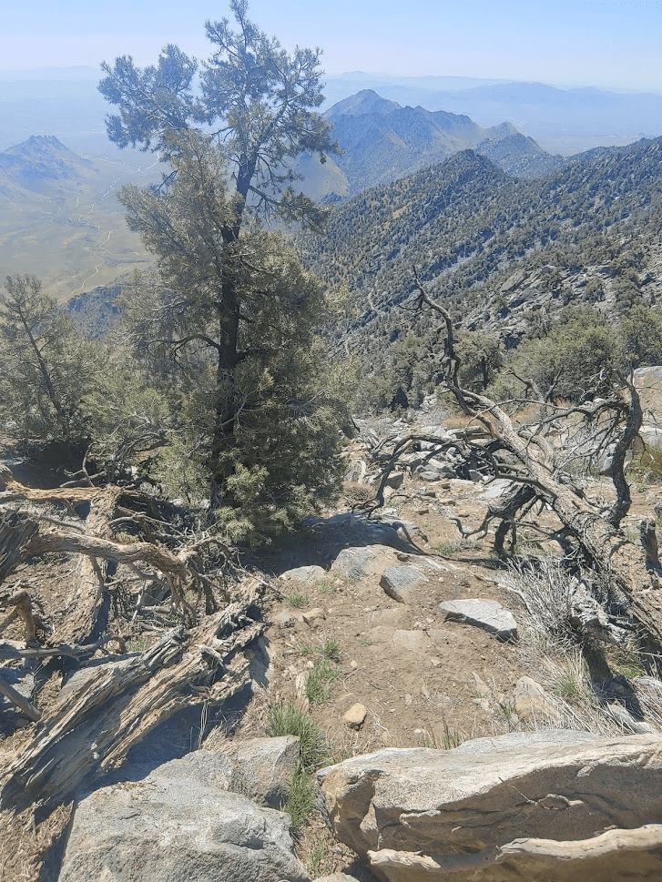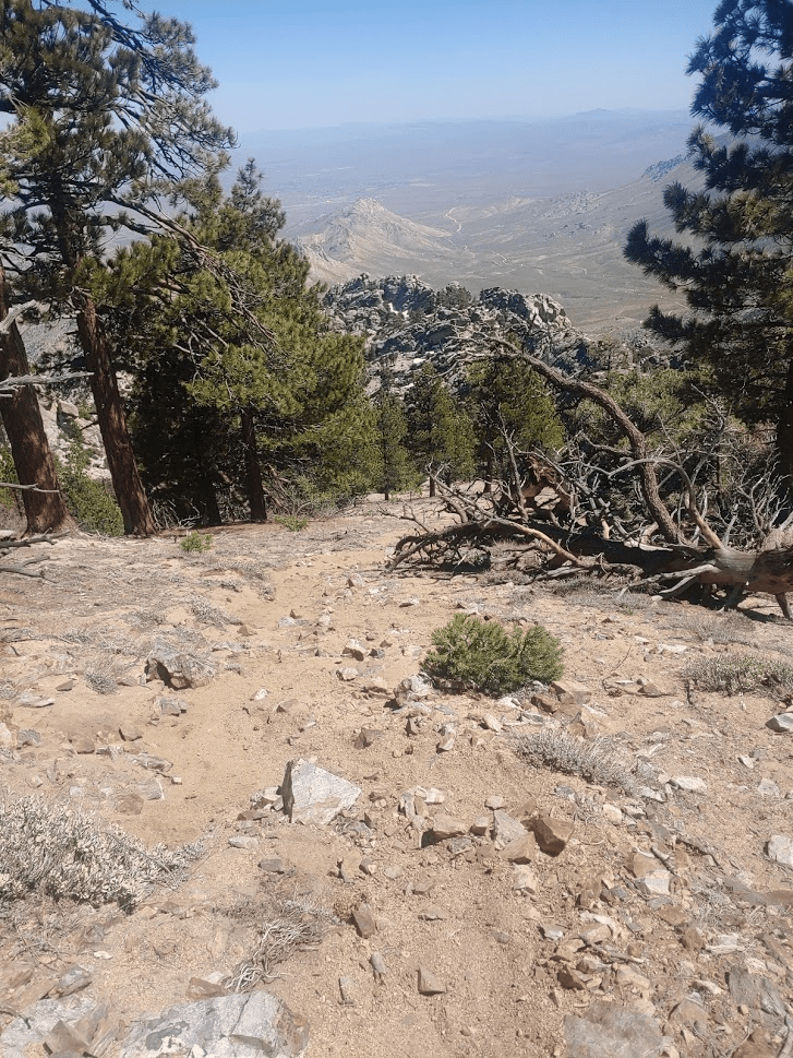 I spent about 50 minutes on the summit before descending. I was planning to take the standard Owens Peak trail back down to the trailhead. It would be about 3 miles with 3000 feet of elevation loss. I had already ascended well over 5000 feet on the day, so my legs were tired, plus it was very hot so I was feeling exhausted. It had been a long day already! The sandy trail began by descending southeast off the peak.