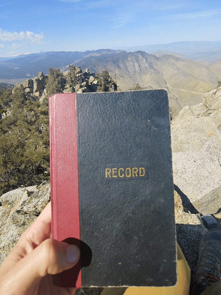 There aren’t any survey markers on this peak. There is a very old register placed in 1961, which was pretty cool. It looked like most of the really old entries were from large Sierra Club parties. There was also a newer book placed in 2001, but the old one wasn’t full yet, so I signed that one. The previous ascent was on April 4th.