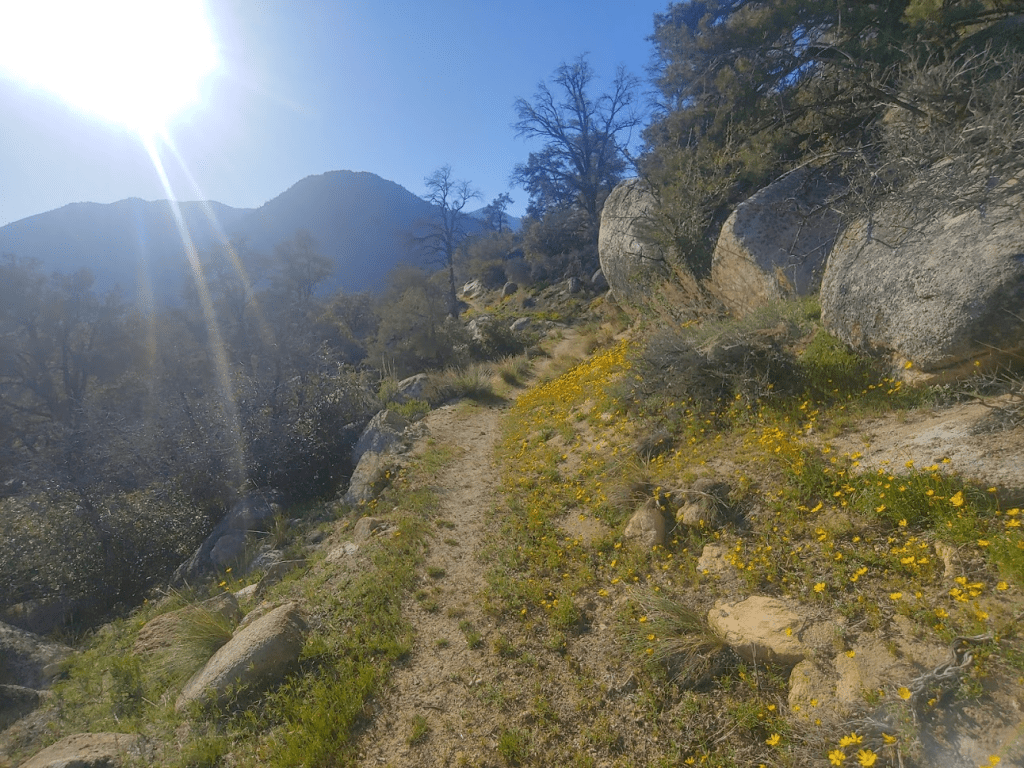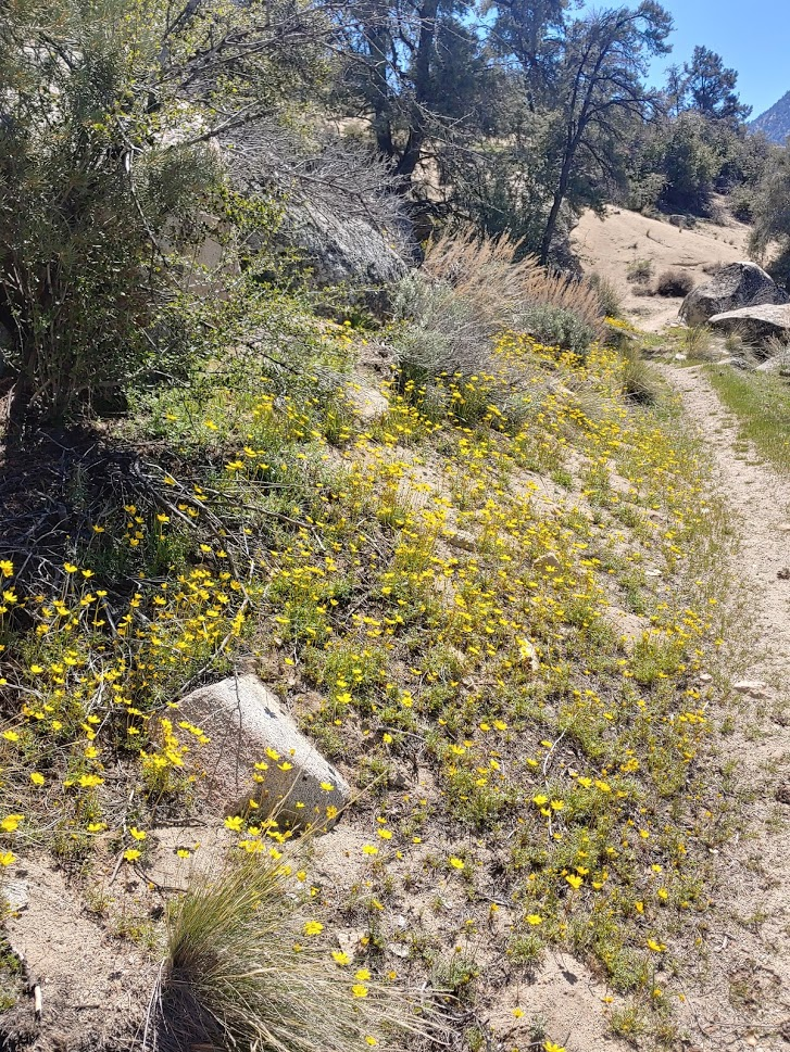 At 0.5 mile, I saw a skunk off to the side of the trail. It definitely saw me, as it had its bushy tail raised in a defensive posture. I gave it a wide berth and continued up the trail. I noticed some pretty yellow flowers along the trail.