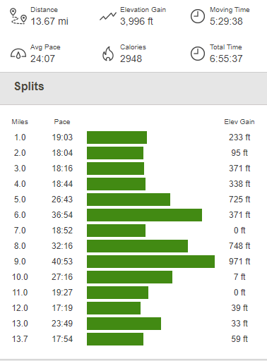 It was now 6:15pm. I packed up my car and drove back down to the highway. The totals for this hike were 13.67 miles, 3996 feet elevation gain, and 6:55:37 total time.