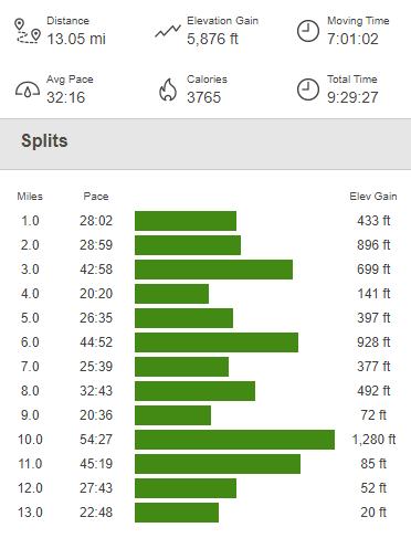 I reached the car once more at 3:45pm. The totals for this hike were 13.05 miles, 5876 feet elevation gain, and 9:29:27 total time.