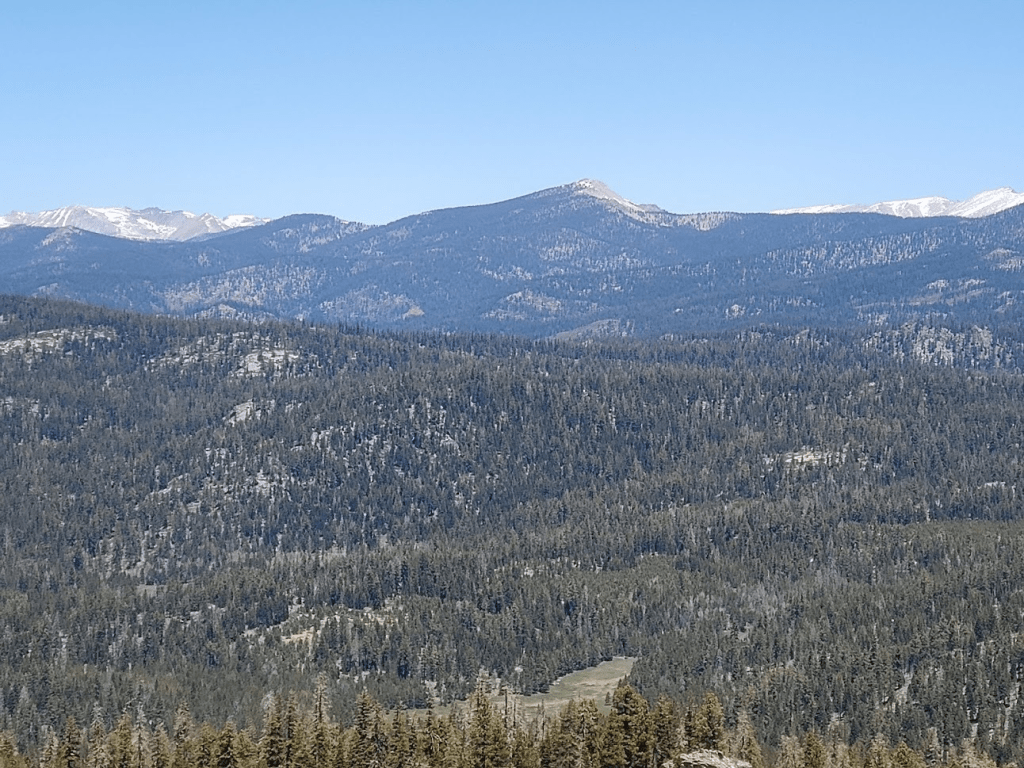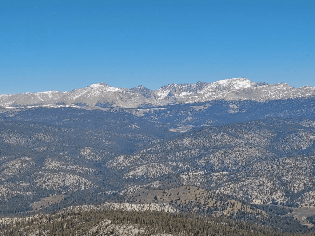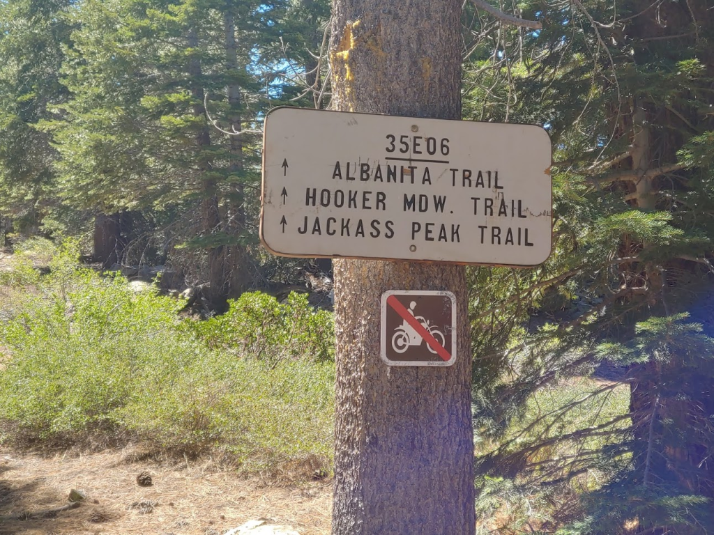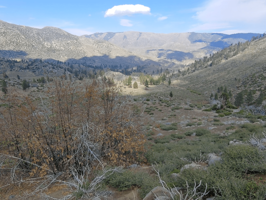 It had been a month since my last trip to the Sierra, and I was already hungry for more. 4 weeks of warm temperatures had brought the snow level up a few thousand feet, so I was excited to hike at higher elevations. I took Friday off of work, hoping to beat the Memorial Day Weekend crowds into the mountains. I got up early as I usually do and hit the road at 5:30am Friday morning. I encountered no traffic issues while driving through the Inland Empire. Things were starting to open back up in the midst of the pandemic, but thankfully traffic still wasn’t at pre-Covid levels. I exited US-395 at 9 Mile Canyon Road which I took up into the mountains. I arrived at Kennedy Meadows Campground in Inyo National Forest around 10:30am. Developed campgrounds in the area were supposed to be closed still, so I was a bit surprised to see a number of campsites occupied. It’s a fairly large campground (37 sites) and most of the sites are shaded under large pinyon pines. I thought this seemed like a good place to spend the night, so I decided to park my car in one of the sites (in case the campground filled up throughout the day). My plan for the day was to climb 9480 foot Crag Peak, which is on the Sierra Club Sierra Peaks Section (SPS) list. Crag Peak actually has 2 summits, the true 9480 foot summit which is recognized by the Sierra Club, and a 9440 foot summit a few hundred feet to the south which is recognized by the USGS and is used on maps. I’m not sure why there is a discrepancy, but I was planning to climb both summits. The route would involve about 5 miles on the Pacific Crest Trail (PCT) which passes through the campground, and then another 2.5 miles cross country to the summit. I got started at 10:45am from 6148 feet. The trail immediately passes through a latched gate (to keep wildlife out of the campground?).