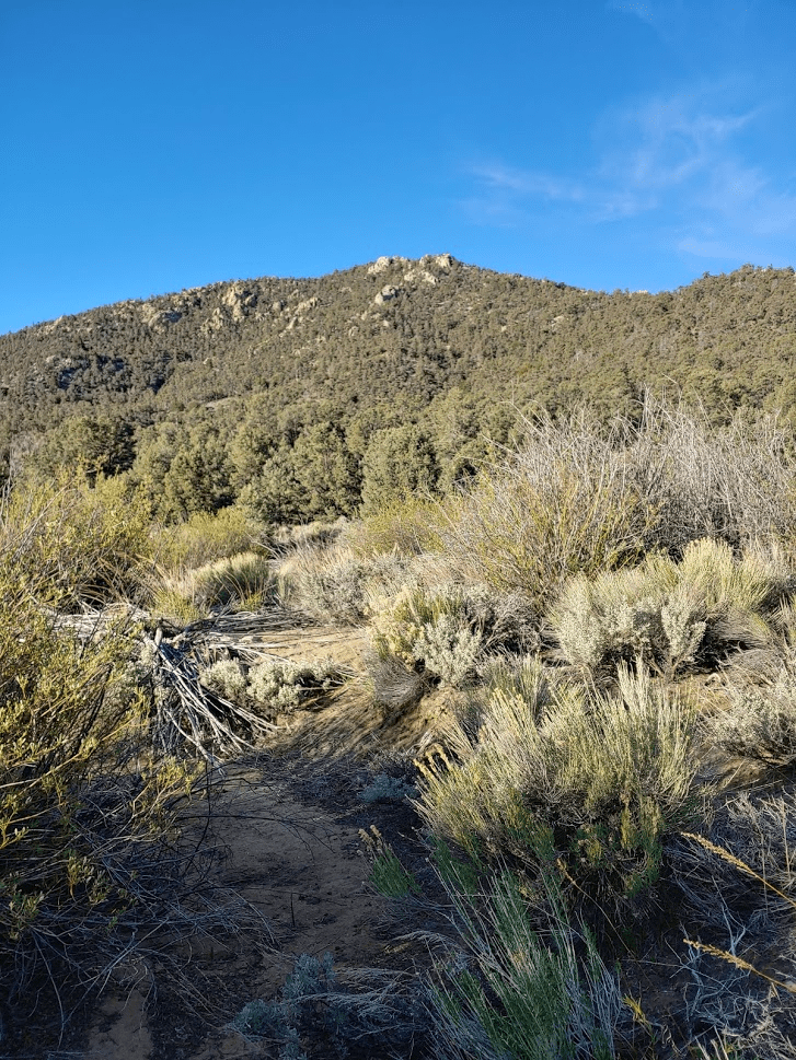 My plan for Saturday was less ambitious. I wanted to save my energy for Sunday (more on that later), so I had a few shorter hikes planned. First up would be 7994 foot Chimney Peak. Chimney misses out on the SPS list, but it is the high point of the Chimney Peak Wilderness. I had recently taken interest in climbing wilderness high points, and it would be a fairly short and easy hike, so I thought it would be a good way to begin the day. I woke up at 5:30am, got ready, and drove southeast on Sherman Pass Road. My car indicated it was 37 degrees when I turned it on, and it dropped to 25 degrees while I was driving. There was no way that could be true – it was chilly, but it was not freezing (37 was probably accurate). After 16 miles I turned west (right) onto Chimney Basin Road which I drove on for a mile before parking just before a locked gate. Apparently, you used to be able to continue driving on this road, but the road was destroyed by a washout many years ago, so the BLM allowed the rancher who owns the adjacent land to gate it off. This didn’t really matter for my purposes though since I was directly north of the peak and wouldn’t have needed to drive closer even if there was no gate. I started hiking at 6:58am from 6646 feet.