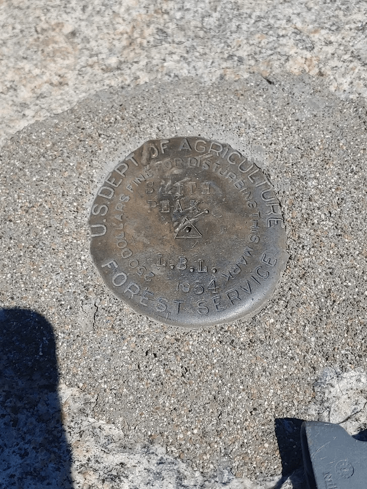 I signed the register from 2014. The previous ascent was from May 8th. I located a benchmark but no reference markers. Interestingly, the benchmark says Smith “Peak” instead of Smith Mountain.