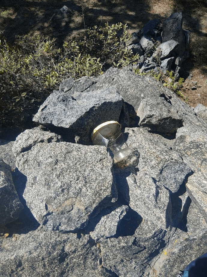 I was a little disappointed that there were no views due to the dense forest cover. Since I had quite a bit of time left in the day, I was hoping to take a longer break on this summit and really soak in the views. After about 10 minutes I started the descent. I had read a few reports mention a pile of rocks about a quarter mile southeast that had a register even though it was not on the high point. I decided to wander in that direction to see if I could find anything. After investigating a few different rock piles, I eventually found a broken glass jar that may have held a register at one time.