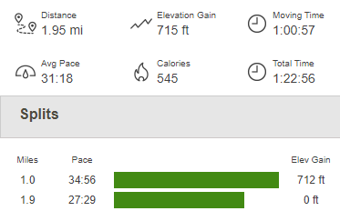 Once more I made quick time down the forested slope. I reached the car at 4:09pm. This hike ended up being 1.95 miles, 715 feet elevation gain, and 1:22:56 total time.