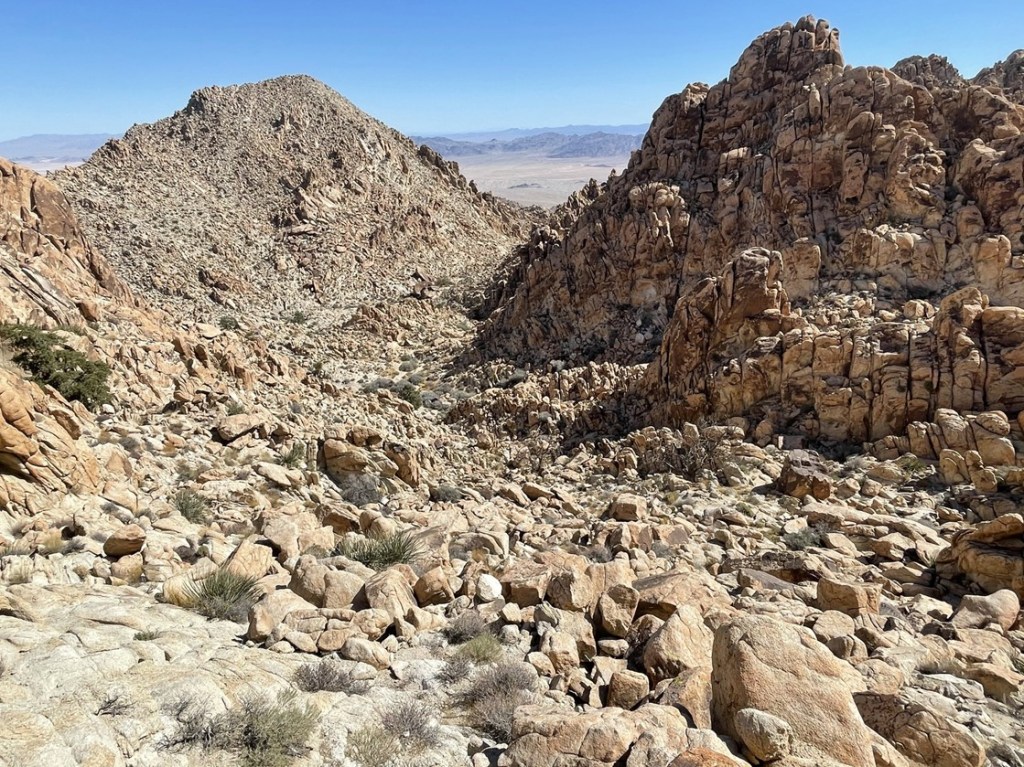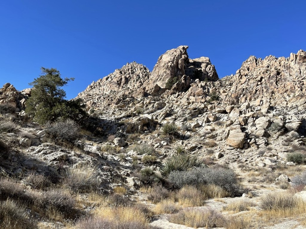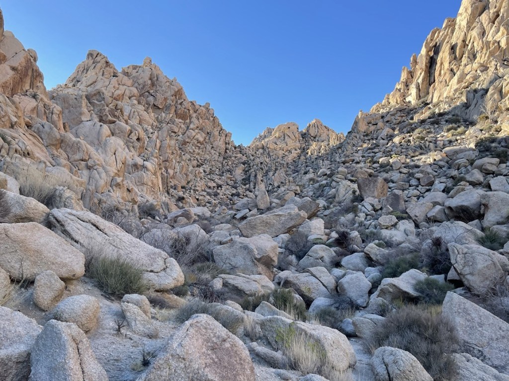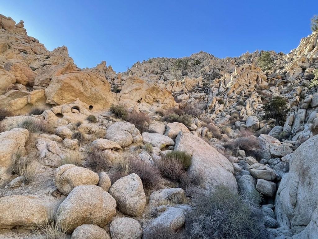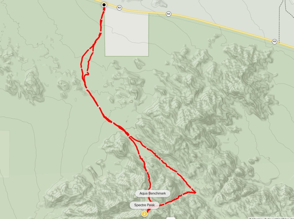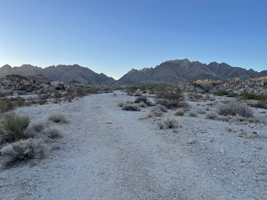 The Coxcomb Mountains are a spectacularly rugged mountain range at the extreme eastern end of Joshua Tree National Park. They were added to the park in 1994 at the same time it was upgraded from National Monument to National Park. The bouldery terrain is much more similar to the nearby Sheephole Mountains than any of the other ranges in the park. There are 3 points of nearly equal height at the upper reaches of the Coxcombs: Spectre Peak (4482 feet), Tensor Point (4419 feet), and Dyadic Point (4360 feet). The names Spectre, Tensor, and Dyadic all refer to some mathematical equation. Spectre Peak is the highest of the 3 and is on the DPS list. Tensor Point, also known as Aqua Benchmark, is the 2nd highest (despite USGS maps showing it as the range high point). Dyadic Point, the lowest of the 3, is a class 4/5 climb, so I would be skipping it this time. I had parked the night before about 4 miles east of the standard trailhead on a dirt road that the DPS guide describes as “good camping.” I woke up early and made the short drive to the trailhead. I was able to park a few dozen feet off the road where the wilderness boundary begins. This made me feel a little better than parking right on the side of the highway. I started hiking at 6:12am from 1724 feet.