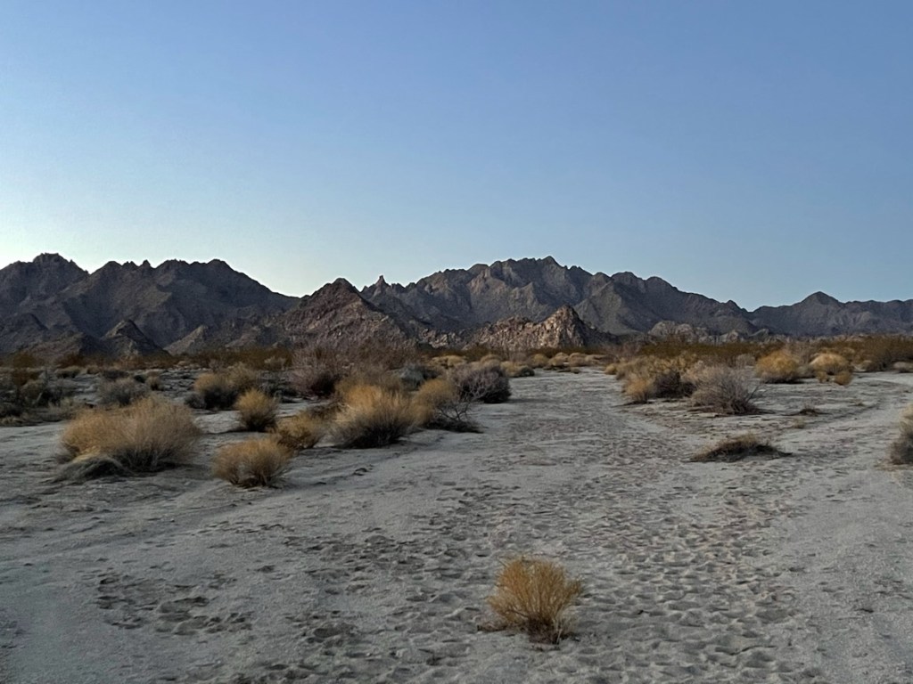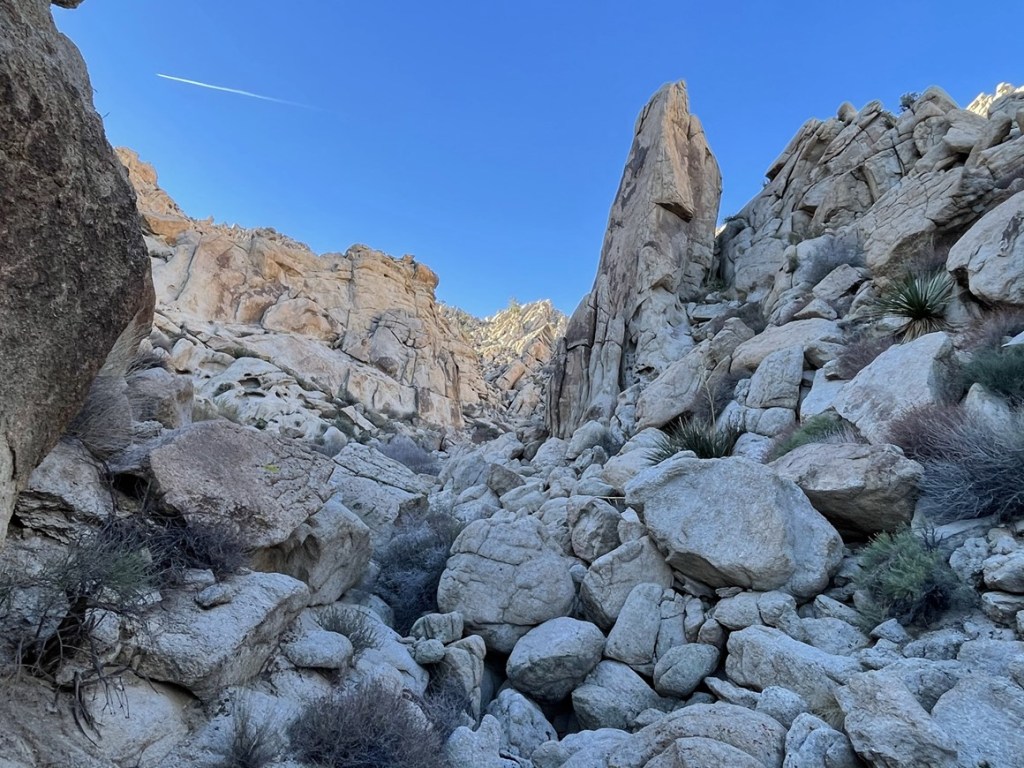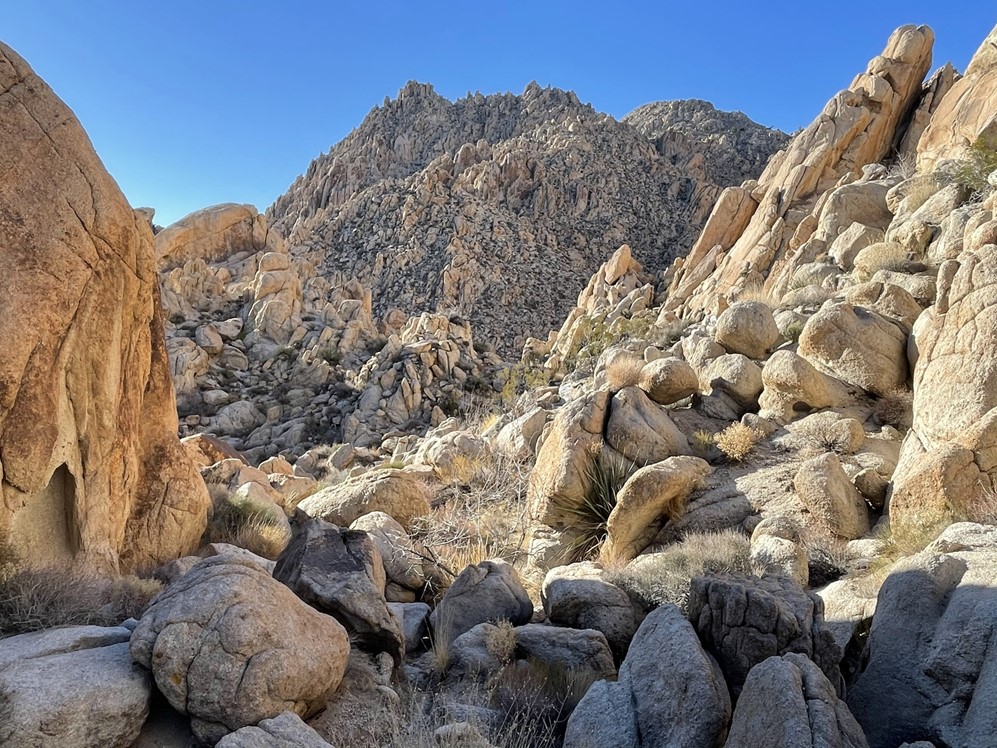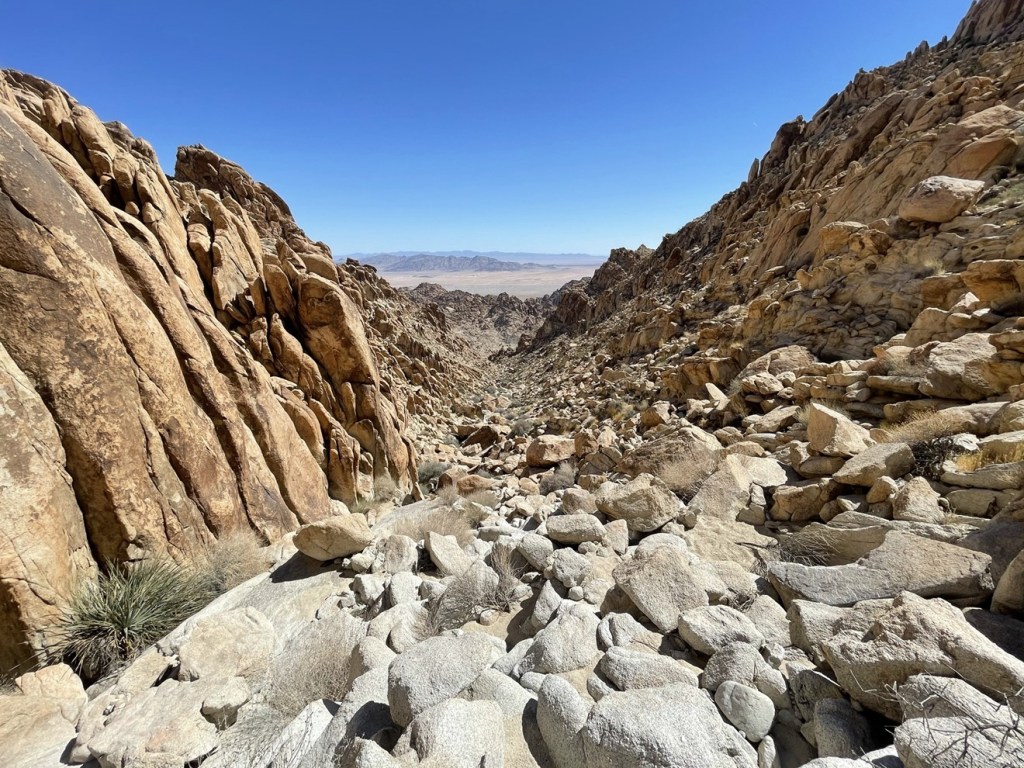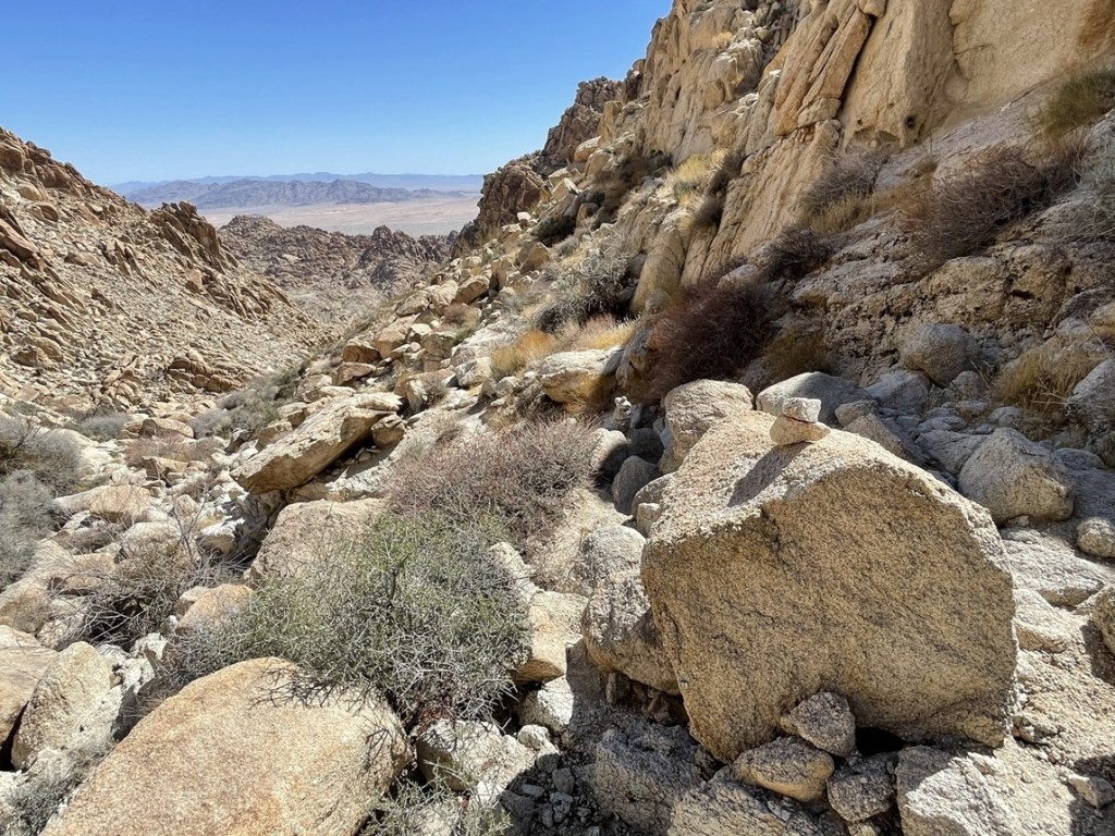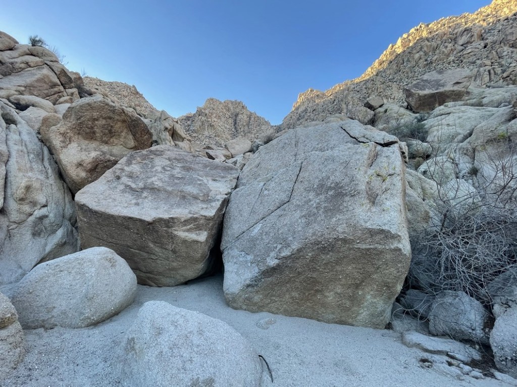 The Coxcomb Mountains are a spectacularly rugged mountain range at the extreme eastern end of Joshua Tree National Park. They were added to the park in 1994 at the same time it was upgraded from National Monument to National Park. The bouldery terrain is much more similar to the nearby Sheephole Mountains than any of the other ranges in the park. There are 3 points of nearly equal height at the upper reaches of the Coxcombs: Spectre Peak (4482 feet), Tensor Point (4419 feet), and Dyadic Point (4360 feet). The names Spectre, Tensor, and Dyadic all refer to some mathematical equation. Spectre Peak is the highest of the 3 and is on the DPS list. Tensor Point, also known as Aqua Benchmark, is the 2nd highest (despite USGS maps showing it as the range high point). Dyadic Point, the lowest of the 3, is a class 4/5 climb, so I would be skipping it this time. I had parked the night before about 4 miles east of the standard trailhead on a dirt road that the DPS guide describes as “good camping.” I woke up early and made the short drive to the trailhead. I was able to park a few dozen feet off the road where the wilderness boundary begins. This made me feel a little better than parking right on the side of the highway. I started hiking at 6:12am from 1724 feet.