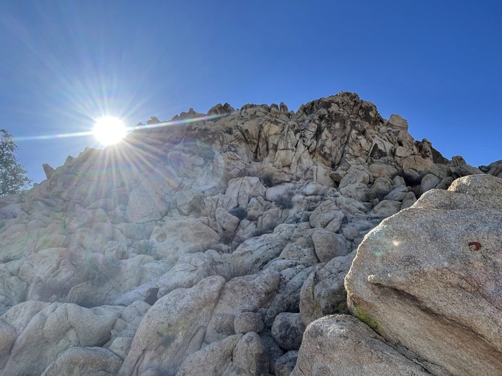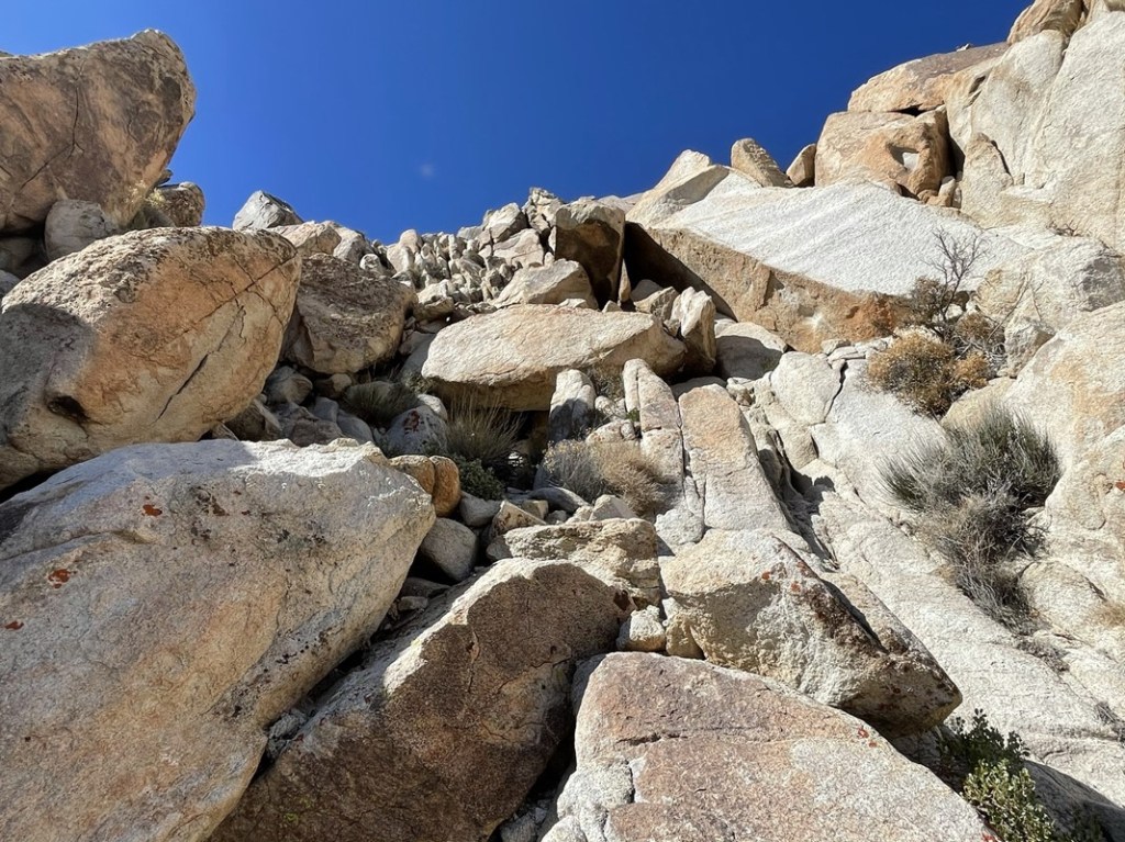Despite the rugged terrain, I was actually really enjoying the scrambling. I had imagined this peak was going to be similar to Sheephole Mountain, which has some absolutely miserable terrain, but I found the rock here to be stable and just lots of fun to climb on. I was also glad I had done most of the ascent up to this point in the shade. The sun was just beginning to poke out.