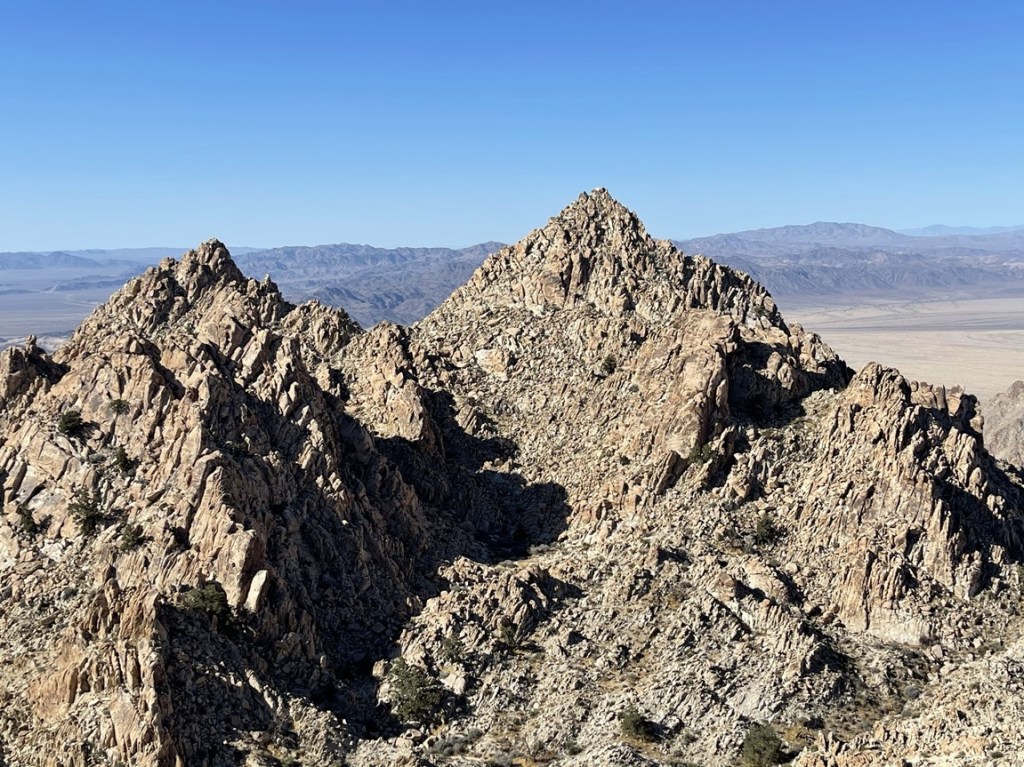 I signed the register which had been placed in 2000. The previous ascent was on March 20th. This peak gets a little more traffic than most of the desert peaks I’ve climbed, likely due to its relative proximity to the inhabited areas of Southern California. It was another clear day, so the views were spectacular. While not as high as the peaks in the western end of the park, Spectre has the pretty cool distinction of being the most prominent peak in Joshua Tree. I recognized many nearby desert peaks, most of which I’ve climbed by this point. I could see Black Butte across I-10 to the south: