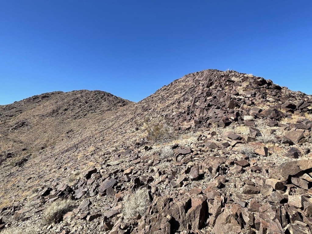 It was early enough that I had time for one more short hike before calling it a weekend. I settled on doing 2290 foot Humbug Mountain, which is a Zdon peak located about 20 miles west of the Coxcombs. It was on the way home, plus the route looked short and easy so I figured it would be a great way to end the trip. I drove west on Highway 62 until reaching Gold Crown Road. I drove south on this well graded road for a few miles before turning west onto another dirt road. This road was rough as it alternated between very sandy and very rocky. I got sick of almost immediately, so I parked about 2 miles away from where Zdon suggests starting the hike. I wasn’t too concerned though since the route is only about a mile round trip (so 5 total for me). I began hiking at 3:03pm from 1696 feet.