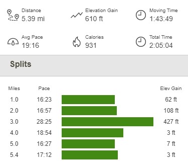 I hiked out to the road and then finally reached the car again at 5:08pm. This hike was a quick 5.39 miles, 610 feet elevation gain, and 2:05:04 total time.