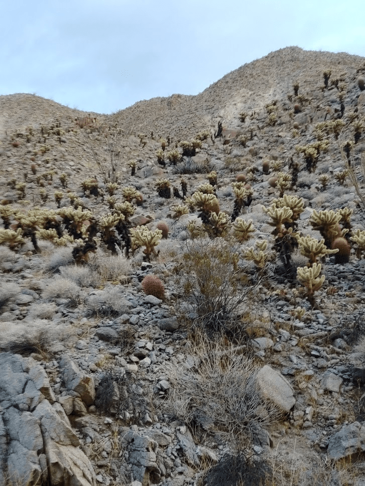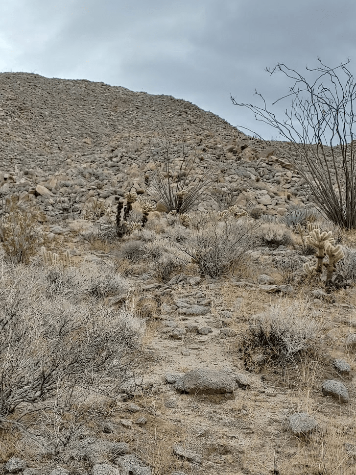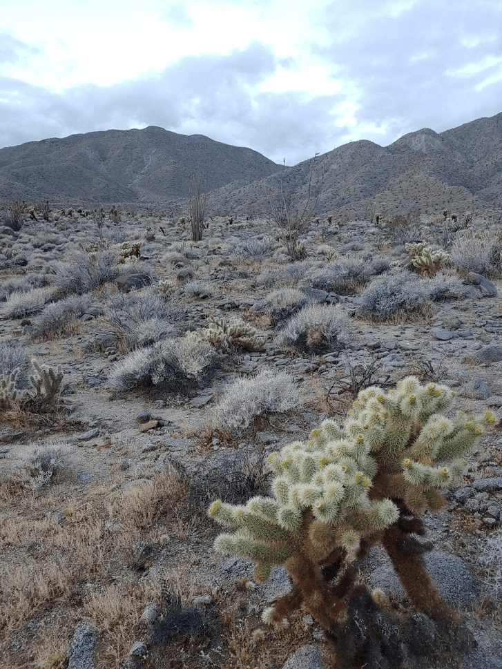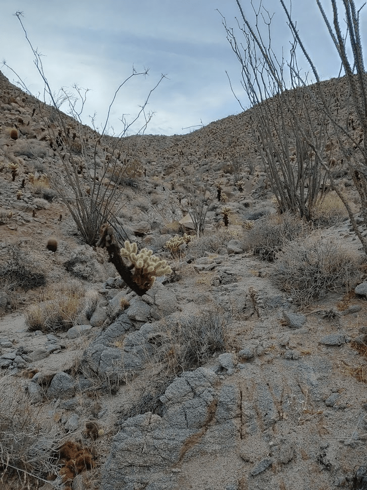 Stage Benchmark is a peak with over 1000 feet of prominence in a small mountain range known as the Tierra Blanca Mountains. This range is basically made up of foothills of the higher Laguna Mountains to the west. I also intended to climb a slightly lower neighboring peak which is unofficially referred to as Moonlight Peak. The only place I actually saw this peak called Moonlight Peak is in the register on the peak itself (Peakbagger just refers to it as Peak 2620). The route begins by crossing about a half mile of open desert. It was cloudy and the temperature was in the 50s, but there was no wind whatsoever, so I was comfortable in just my jacket. There were large amounts of teddy bear cholla and dodging these unfriendly cacti would be become a theme for the day.