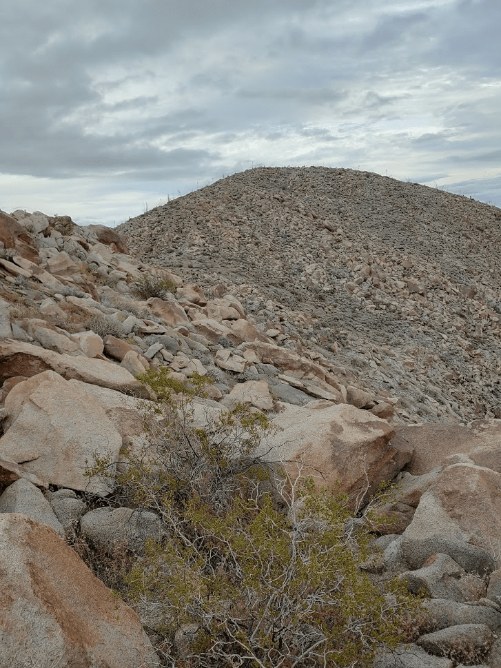 At 9:19am I was down on the Inner Pasture once more. It started to drizzle on me a little as I hiked over to the western base of Stage. I ascended a rocky wash in a southeasterly direction and then turned to the northeast as I got on top of the main ridge. Similar to Moonlight, the main ridge is broad and gently slopes upwards towards the summit area.