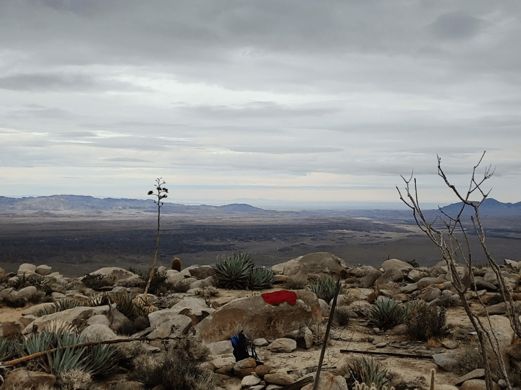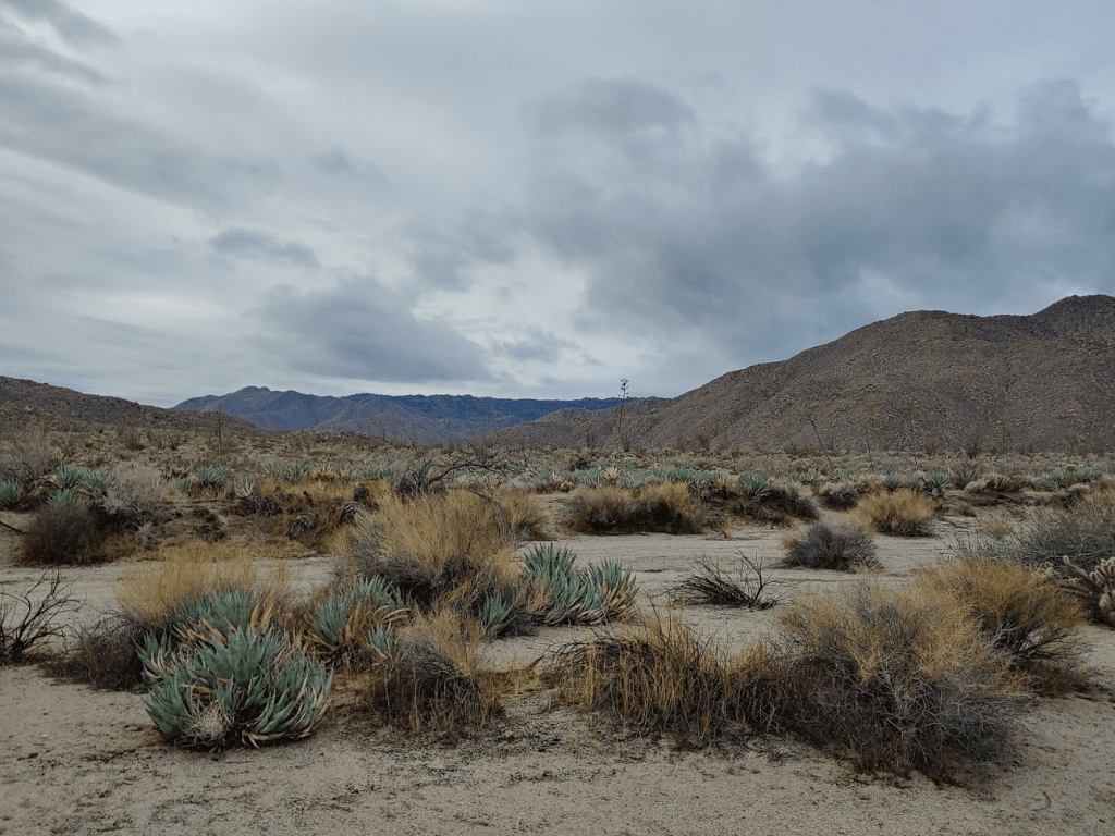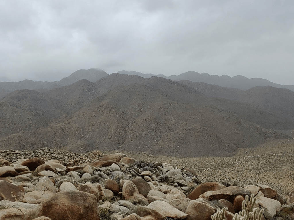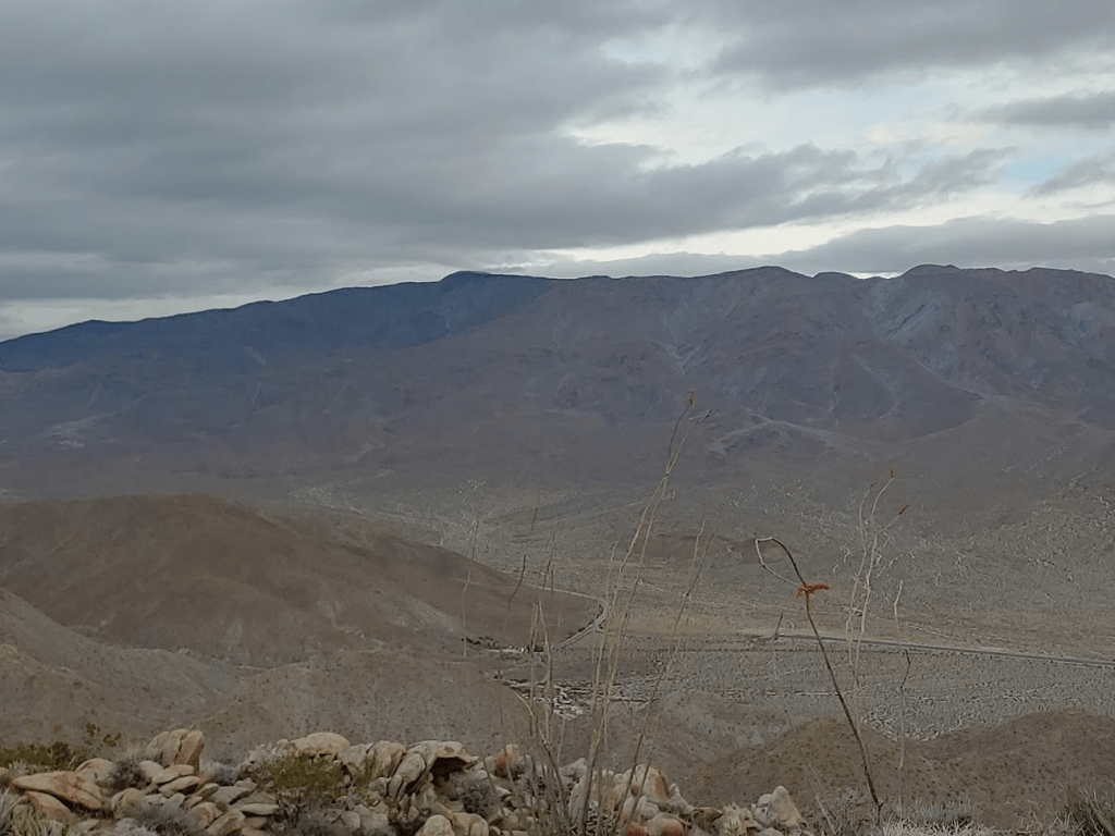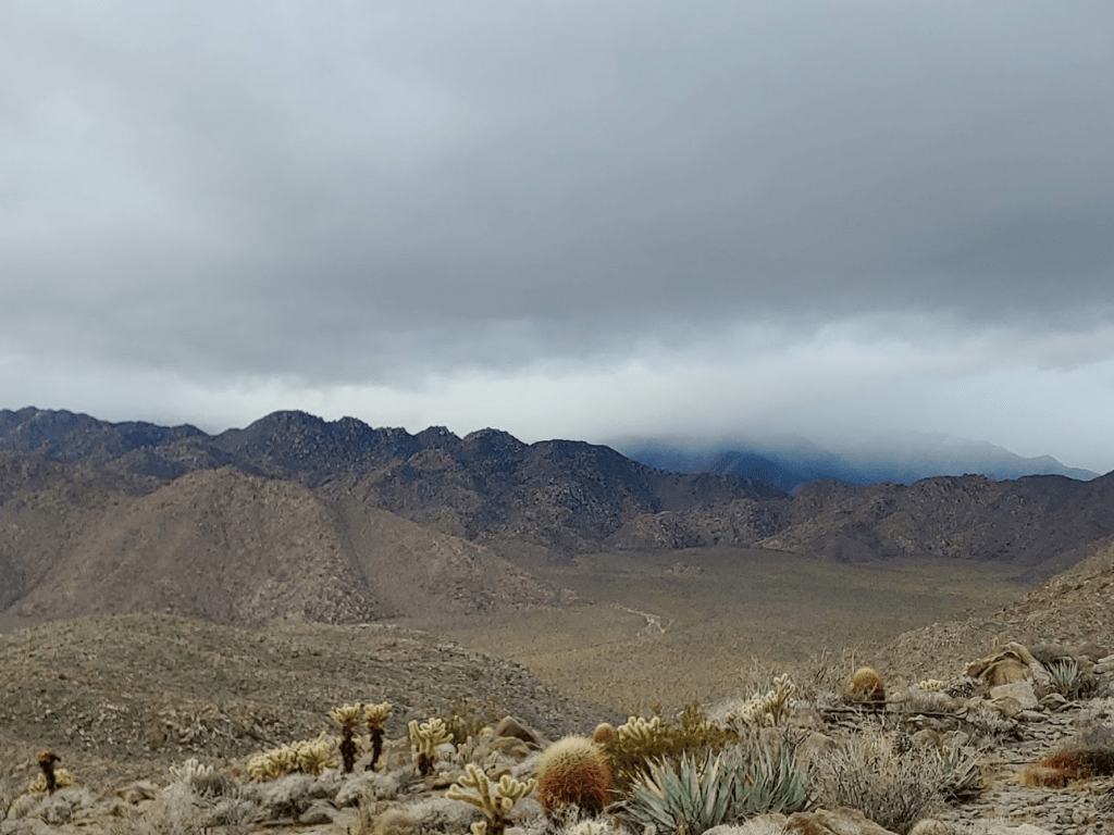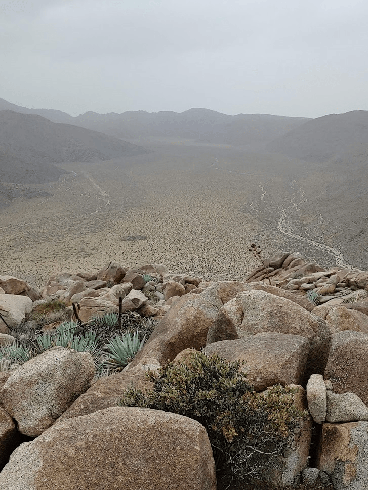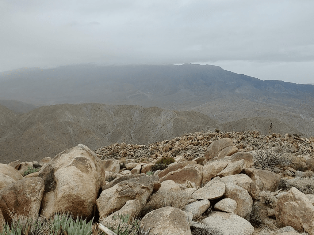 I put my jacket on to keep warm from the rain. I spent just over 20 minutes on the summit before heading down. I normally would have stayed longer but I was concerned about descending if the rain got worse and really made things slippery. It took me an hour to reach the mouth of the canyon once more. The rain stopped during the descent and I took my jacket off again. I then made my way back down the final 3 miles through the canyon and back to my car. Despite the clouds and somewhat rainy conditions, it was an excellent hike, and it felt great to get back out to the desert and explore yet another part of Anza Borrego. The drive home over the mountains was so foggy at times that it slowed traffic down. I made it home around 2:30. Final stats for the day were 12.5 miles, 2598 feet elevation gain, and 6:03:46 total time.