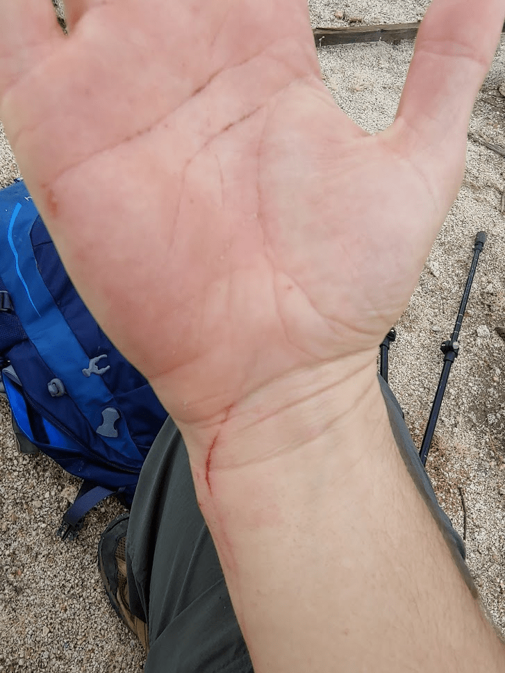I ate a nature valley bar and after about ten minutes on top I started heading back down. The footing coming down was a little tricky and I slipped 2 or 3 times. On one such occasion I accidentally scraped my hand on a barrel cactus.