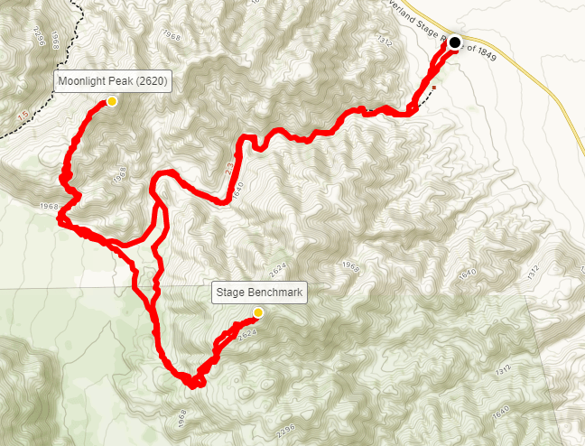 I was now in between the 2 peaks, with Moonlight to the north and Stage to the south. I decided to head up to Moonlight first. I made my way over to the base of the peak and began climbing up a small wash in a northeasterly direction.