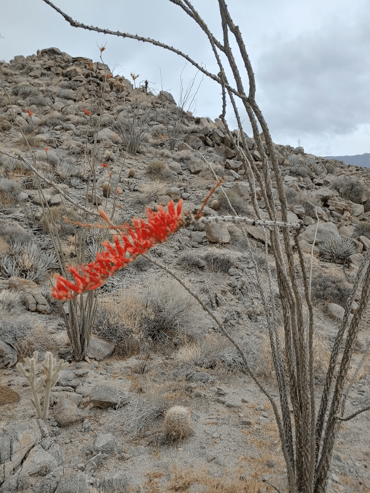 The other plants I saw were the usual ones you encounter in the low desert – barrel cacti, agave, beavertail, ocotillo, etc. Ocotillo normally look dead throughout the year, but after a rain storm they will sprout little leaves and have red blooms on the end.
