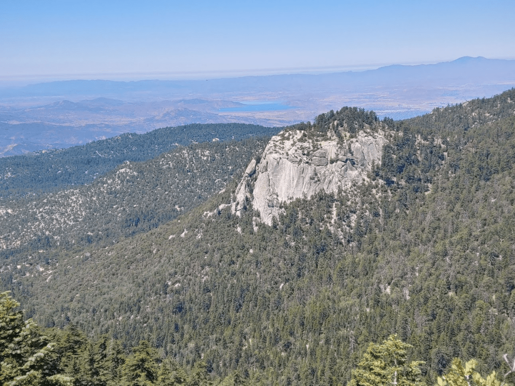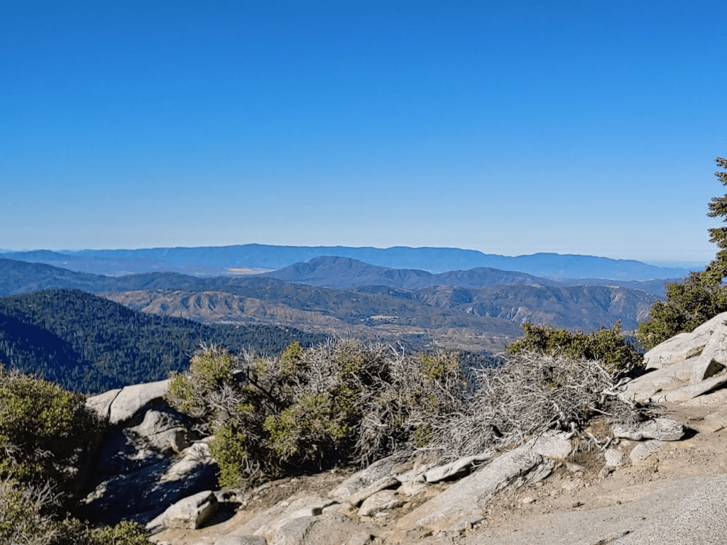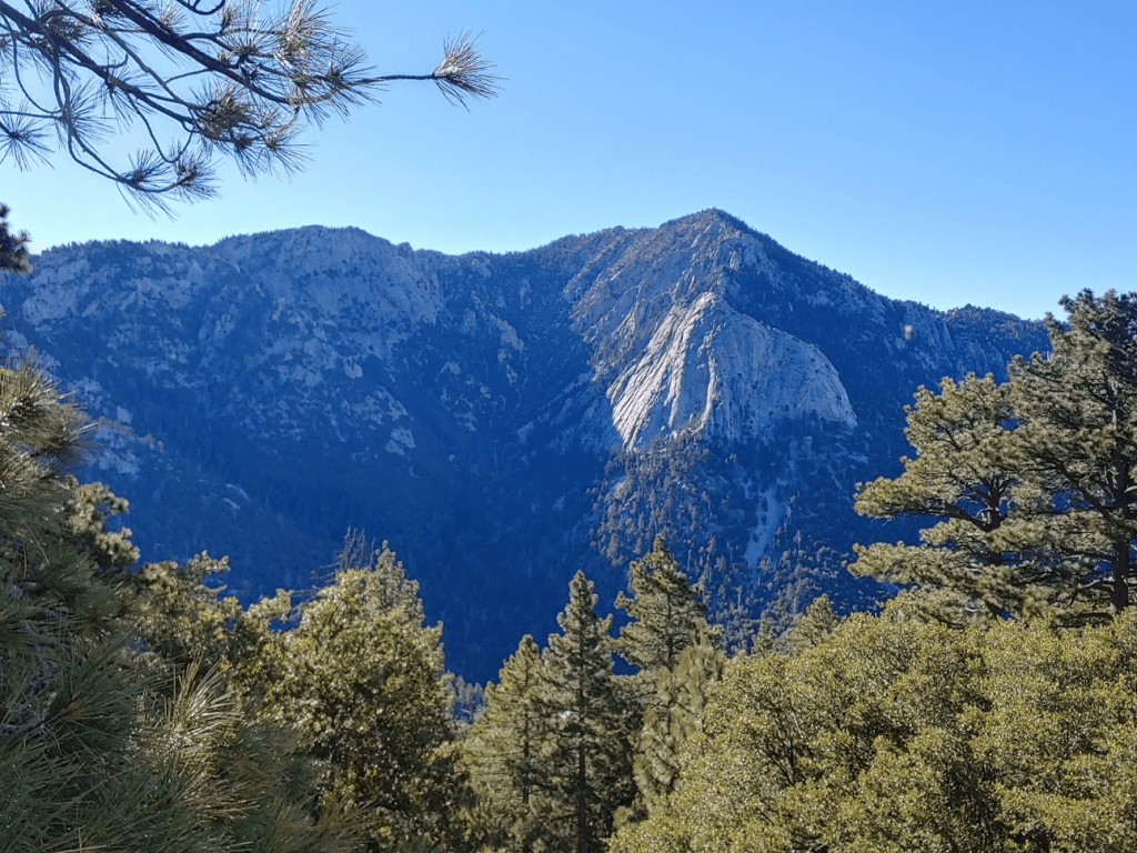 I signed the register and had a quick snack. There weren’t any views on the summit due to tree cover, so I hiked back down to where the trail ends. This area is right above the granite slabs and is an excellent viewpoint. Tahquitz Peak looked very impressive across the valley. Tahquitz was the first peak I climbed after purchasing my new Subaru Forester back in November. The rock feature in the middle of the mountain is Lily Rock (sometimes called Tahquitz Rock). Lily Rock is a very popular rock climbing objective.