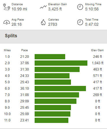 I reached the car again at 12:50pm. My leg hurt a lot during the descent, but it was tolerable. I realized that I hiked over 8 miles from the point where I fell. I definitely needed a few days off after this hike! Totals for the day were 10.99 miles, 3425 feet elevation gain, and 5:47:02 total time.