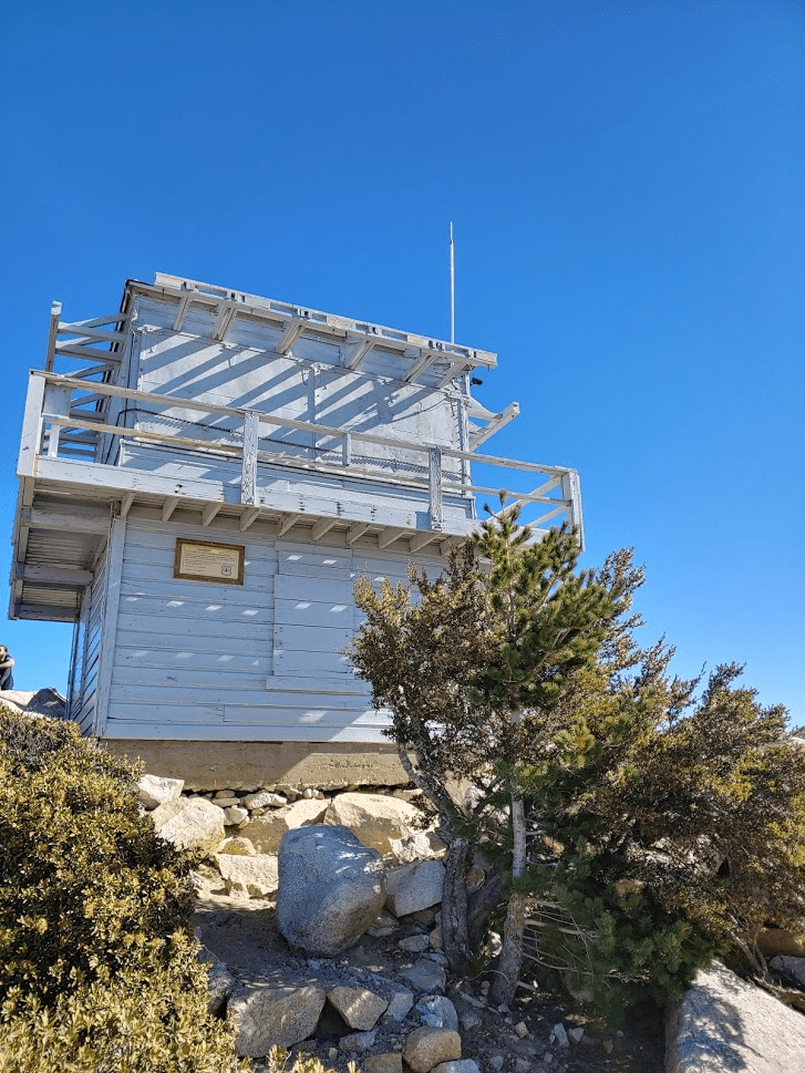 I took my longest break of the day here since this was the half way point of the day. I had another apple and a few more granola bars. I found the summit register among some rocks and signed it. After about a half hour I began my descent. It took me about 10 minutes to make my way down the slope and find the trail again. Once on the trail, I made quick time heading back the way I came. It was getting warm now and the wind was dying down so I took off my jacket and converted my pants into shorts. I passed the junctions I went through before and by 12:10 I had reached the fire lookout on Tahquitz once more. It appeared that in the 3 hours since I had been there the volunteers had finished closing the tower for the season. It was now boarded up: