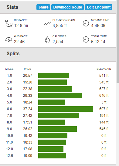I reached my car again at about 1:30. I stopped in Temecula for dinner and was home around 4. My final stats for the day were 12.6 miles, 3855 feet elevation gain, 6:12:14 total time