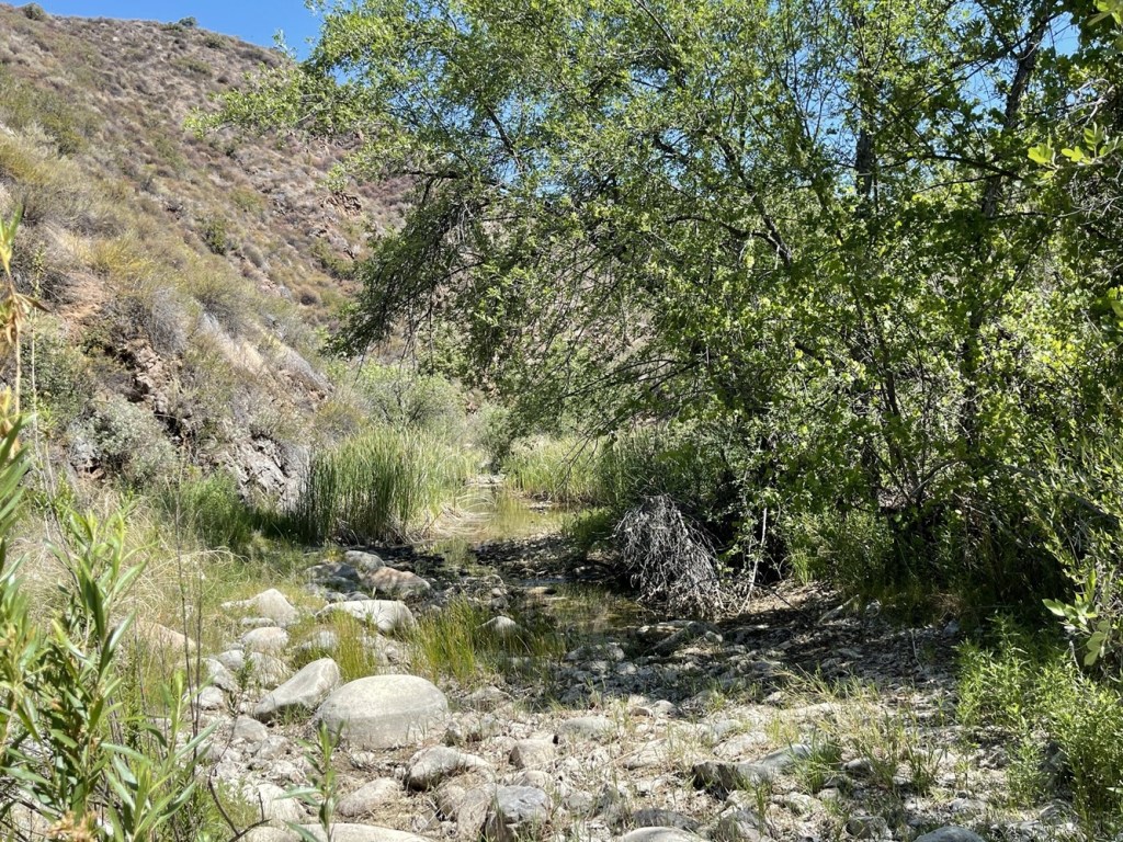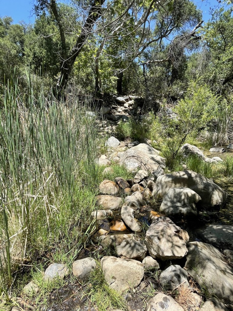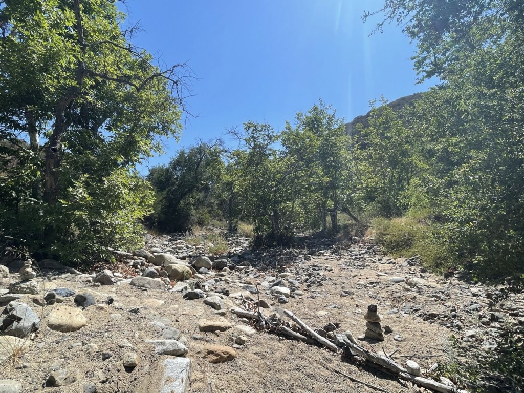 We hiked north along the western edge of the creek and then crossed back to the other side at 2.8 miles. There was some water in the creek here.