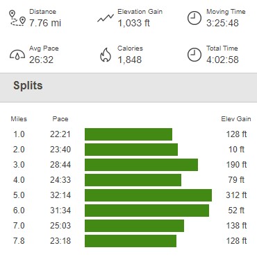 We reached the Tenaja Falls Trailhead at 6.2 miles. We then walked the remaining 1.5 miles along the paved road back to the Fisherman’s Camp Trailhead. We reached the car again at 1:28pm. This hike totaled 7.76 miles, 1033 feet elevation gain, and 4:02:58 total time.