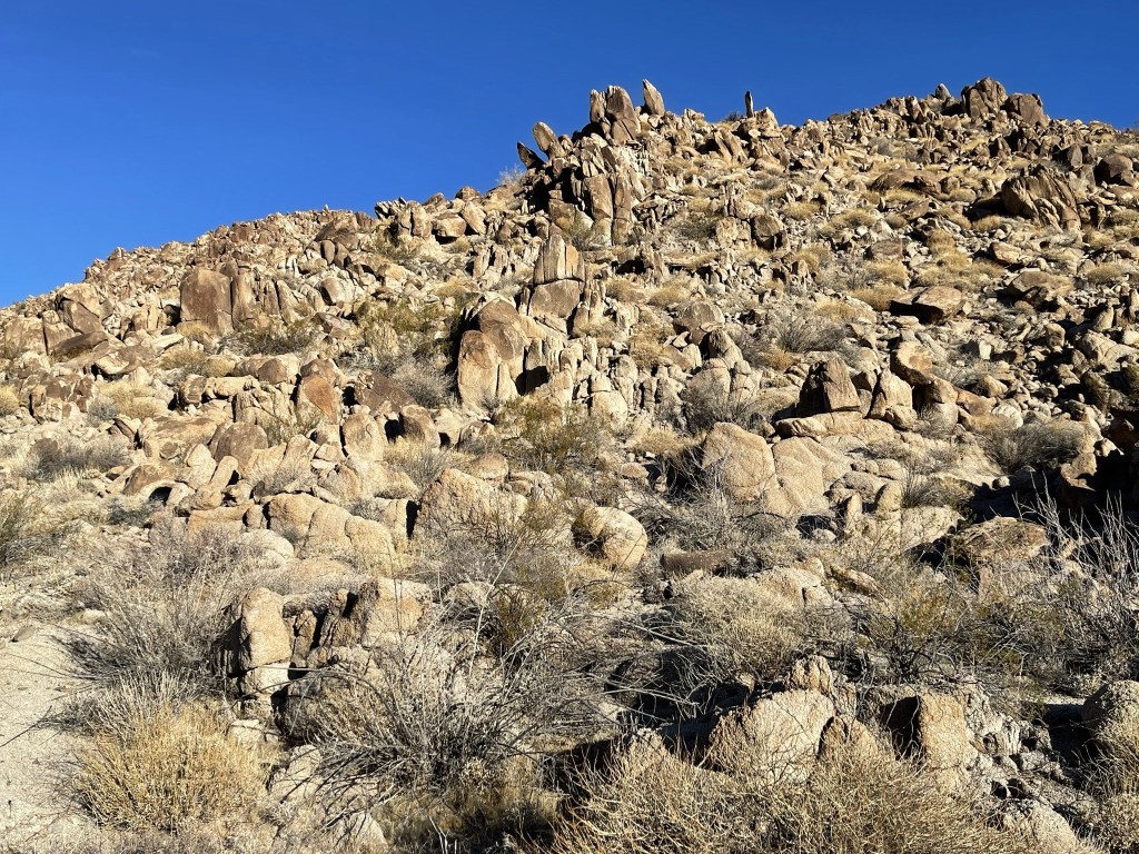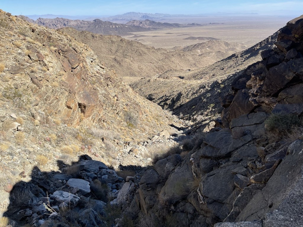 The angle was so steep that I had to descend very slowly. If I did this hike again, I would definitely choose a different ridge to descend. I soon dropped into a steep wash on the left.