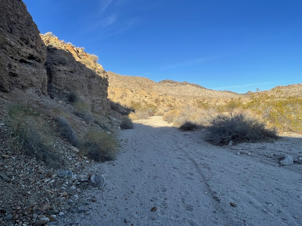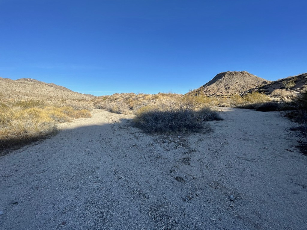 At 5.2 miles, I reached a fork and went left. At 5.8 miles, I finally reached the end of the road and dropped into a large wash.
