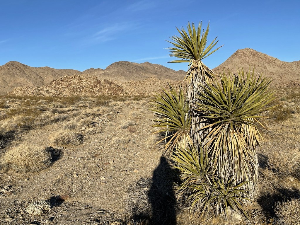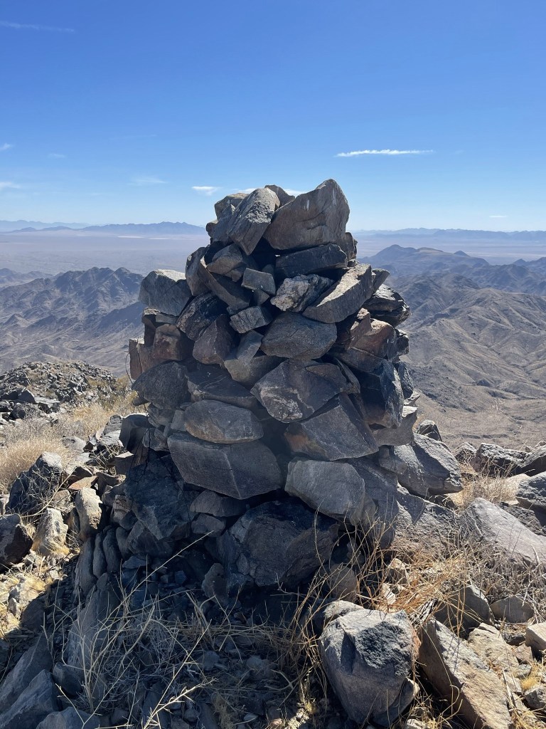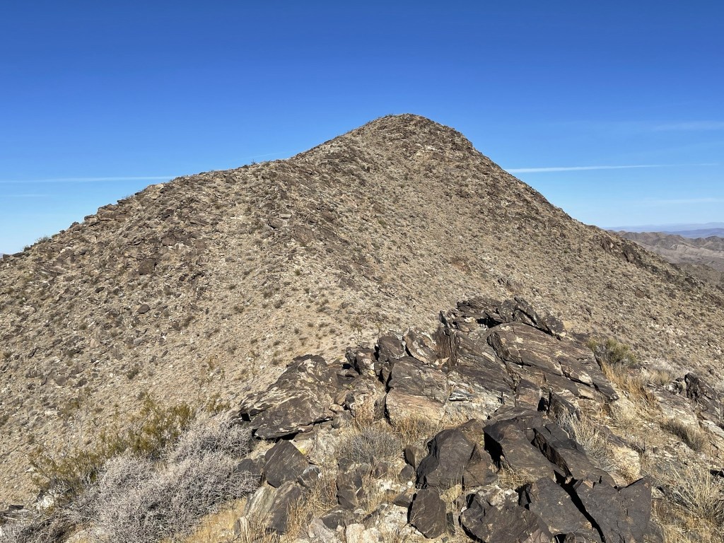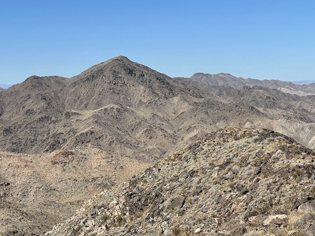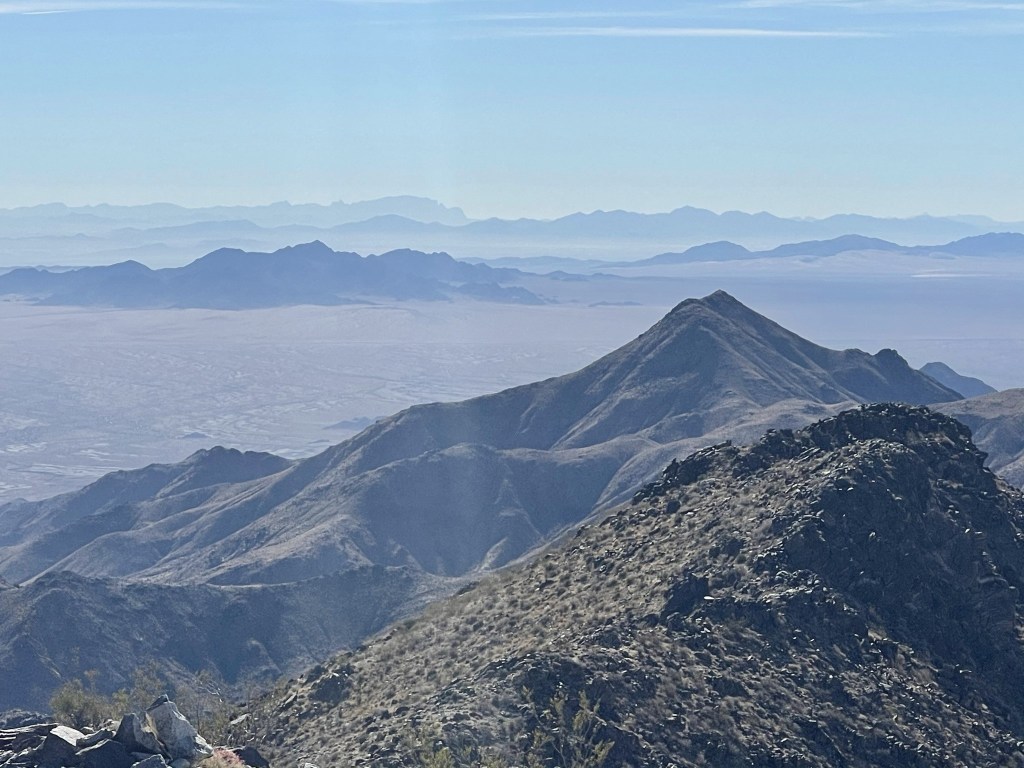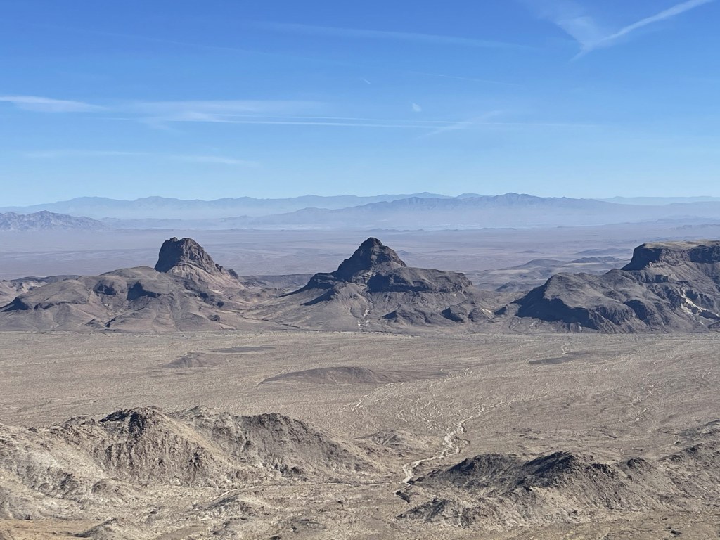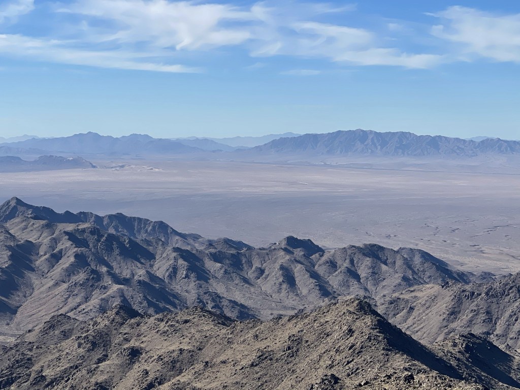 I signed the register which dated back to 2000. The previous ascent was on April 4th, 2020. I noted some of the earlier entries complaining about the wilderness boundary preventing people from driving closer to the peak. Most of these desert wilderness areas were created by the California Desert Protection Act of 1994. Before then, many desert peaks were shorter hikes. I personally think having wilderness areas is a great idea and necessary for a healthy ecosystem. And besides, if you don’t like hiking than what are you doing out here? I get that hiking on roads isn’t very exciting, but I still enjoy being outdoors no matter what kind of hiking I’m doing. Anyway, it was much less hazy than the previous day, so the views were outstanding. I had a great view of Mopah Point (left) and Umpah Peak (right) just a few miles east. These peaks are located within a subrange of the Turtle Mountains. In the distance, Crossman Peak and Hualapai Peak could be seen across the Colorado River in Arizona.