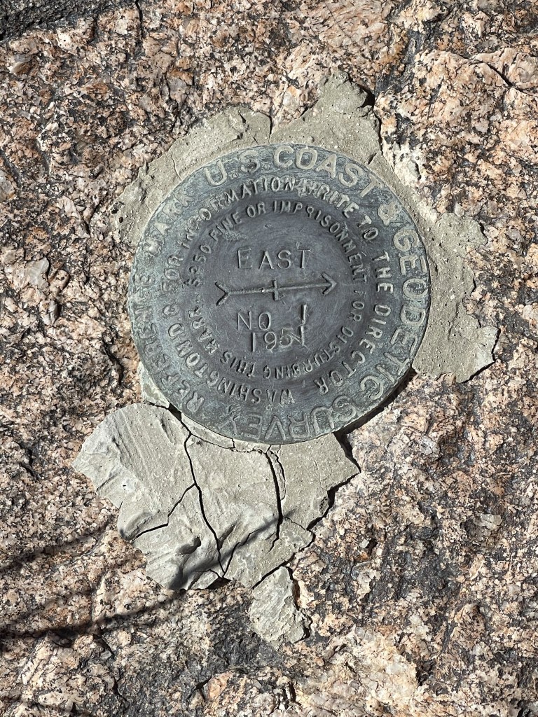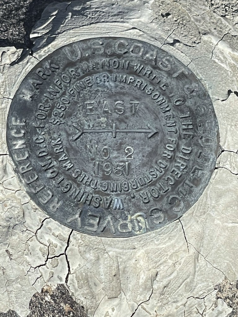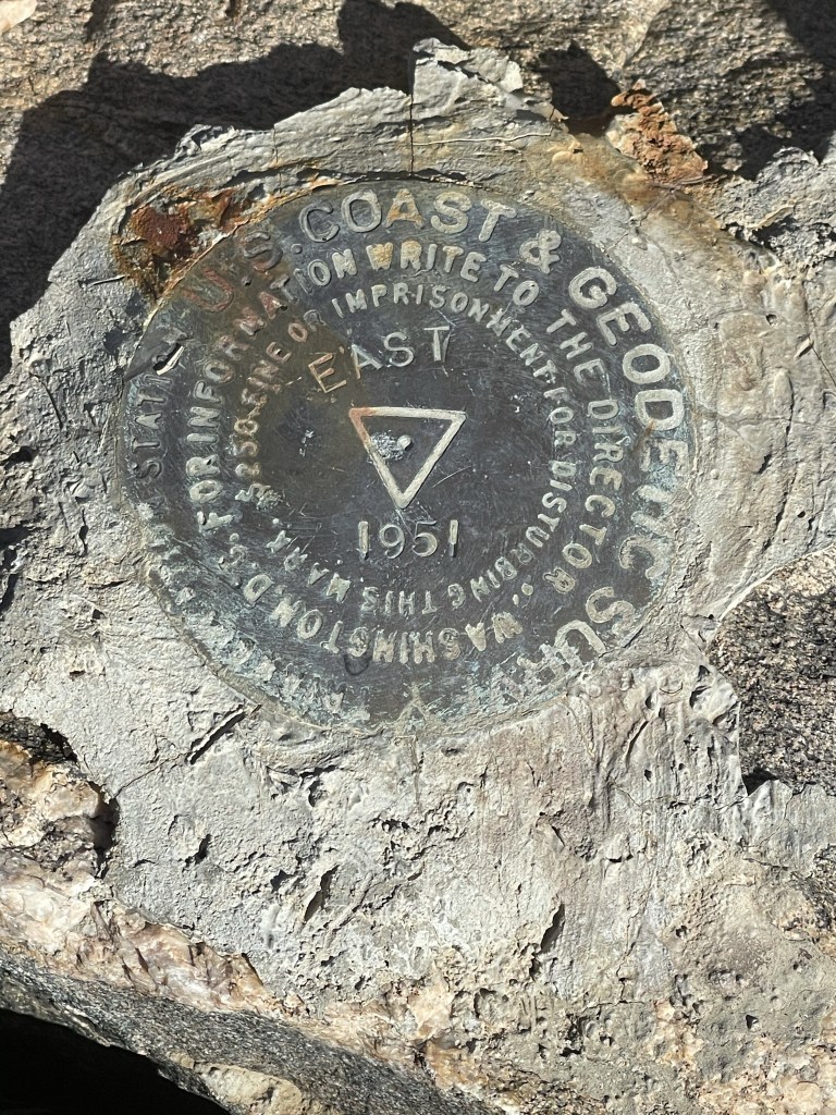 I reached the top at 12:10pm at 12.2 miles! I signed the register which dated all the way back to 1969. There seemed to be some confusion among the earlier entries whether this was the high point of the Turtle Mountains or not. Someone wrote a very long entry about wandering around looking for the Sierra Club DPS summit. Someone else wrote a few years later “Why the fuck would anyone care if a peak is on some Sierra Club list or not?” I located the “East” benchmark, as well 2 reference markers.