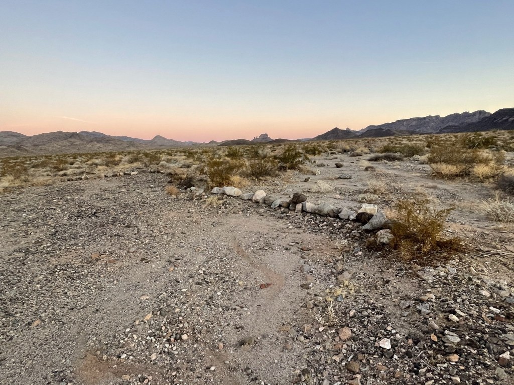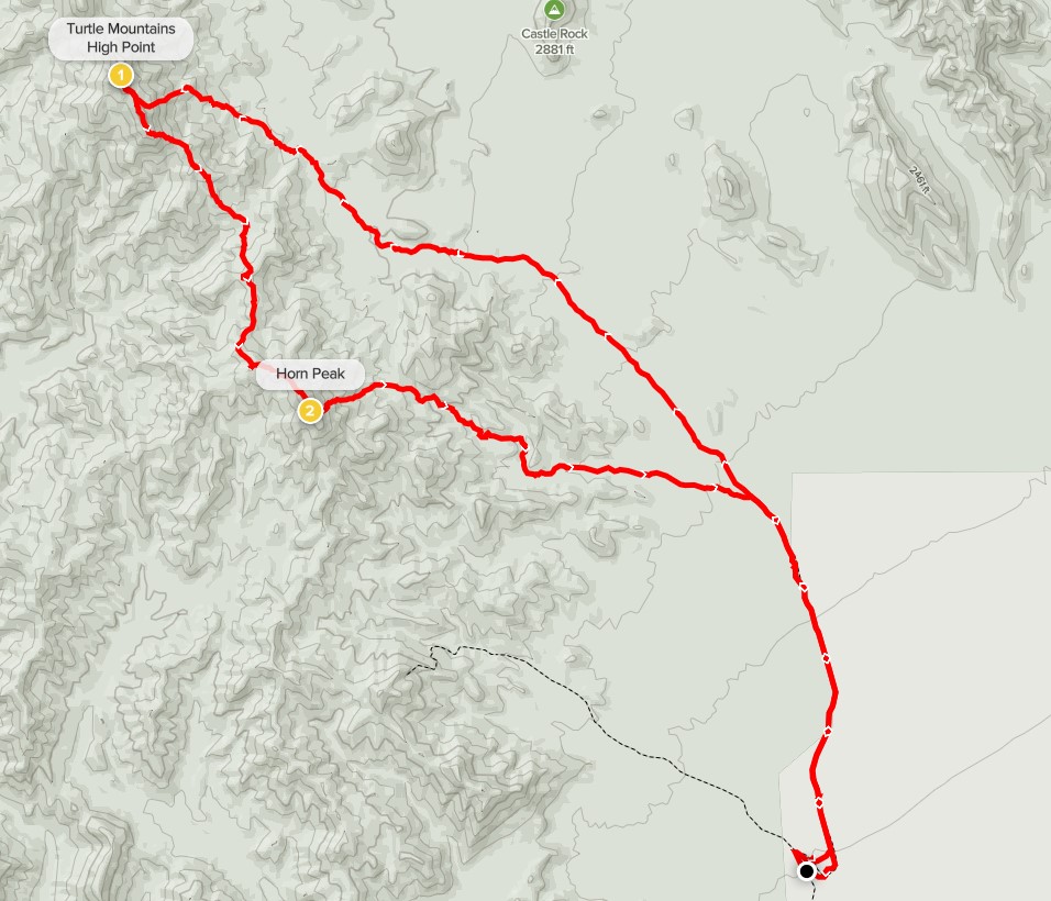 My plan for Sunday was to hike Turtle Mountains High Point (4298 feet). I had driven in the night before but stopped about 2.5 miles short of the DPS trailhead at the point where the road enters a large wash. Both the DPS directions and Zdon’s book warn to be careful here, especially at night. The road up to this point isn’t too bad, but it is about 8 miles from the highway. I woke up pretty early Sunday morning and didn’t feel like waiting around for daylight. Plus, I really am a pretty nervous driver and I don’t like to take chances by myself. Starting from this point would add 5 miles to the hike, which would turn this into a pretty long day (>18 miles). I didn’t mind a little extra hiking though. I got started at 5:36am from 1473 feet above sea level.