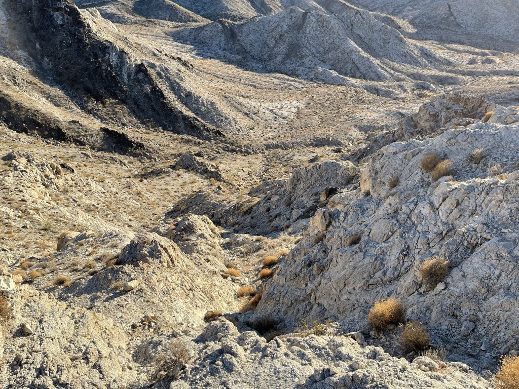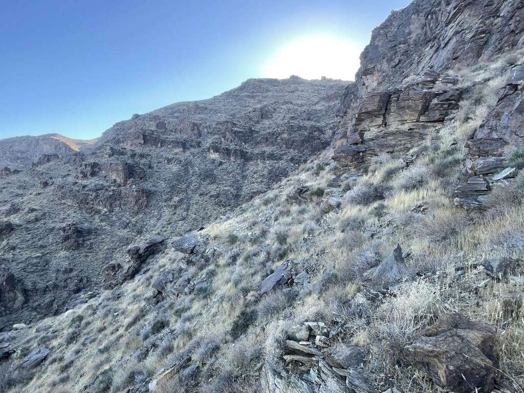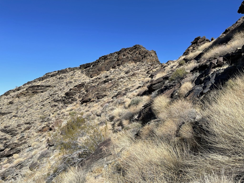 I curved around the upper ridge and descended the steep gully I came up earlier. I then traversed the same hillside from before and reached the small plateau at 7.7 miles. Here I decided to take a different route the rest of the way down. I had ascended DPS Route B up the wash, and I planned to descend Route C down a ridge. The descent ridge runs parallel to the wash. First, I made a nearly 300 foot ascent to gain the top of the ridge.