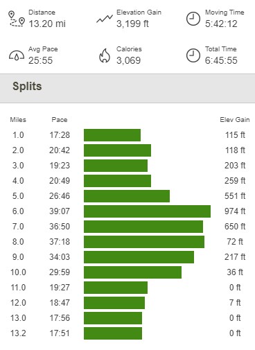 Once past the mine, the rest of the hike was easy road walking. I reached the car at 1pm. This hike totaled 13.2 miles, 3199 feet elevation gain, and 6:45:55 total time.