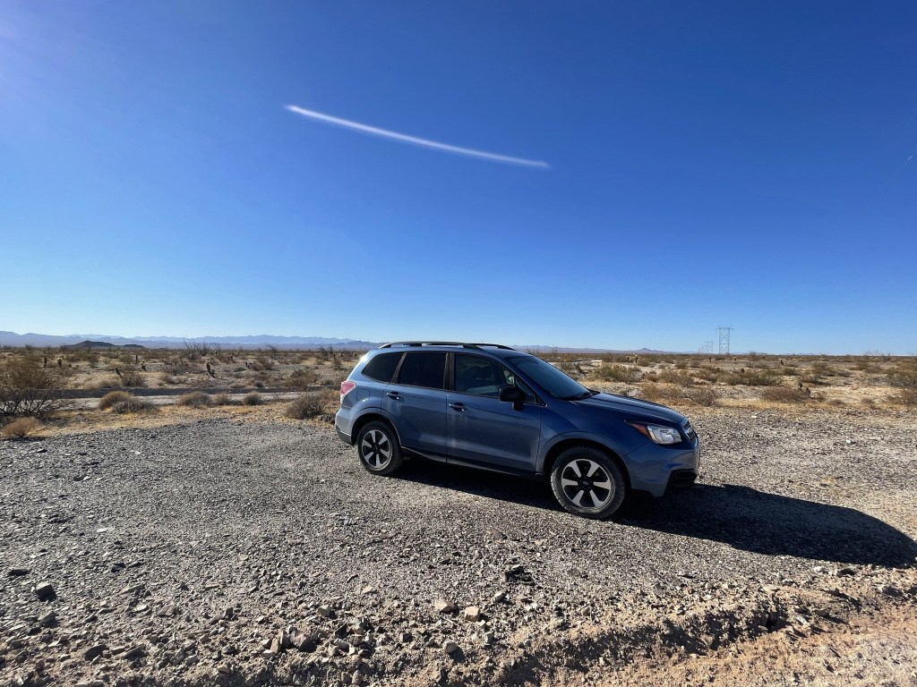 I woke up early the next day to finish the drive. I drove a bit further down the power line road and then turned right onto another road heading south. This road was pretty rough, so I had to go slow. There were sections where the center was pretty high which made me nervous. After a few miles I turned southeast on War Eagle Mine Road. This road starts out very rough as it navigates through a wash almost immediately. I decided I had had enough so I parked there. I could have driven the remaining 1.5 miles to the trailhead, but I’m a nervous driver and I definitely don’t mind a little extra hiking. I began hiking towards Whipple at 6:14am from 1466 feet above sea level.