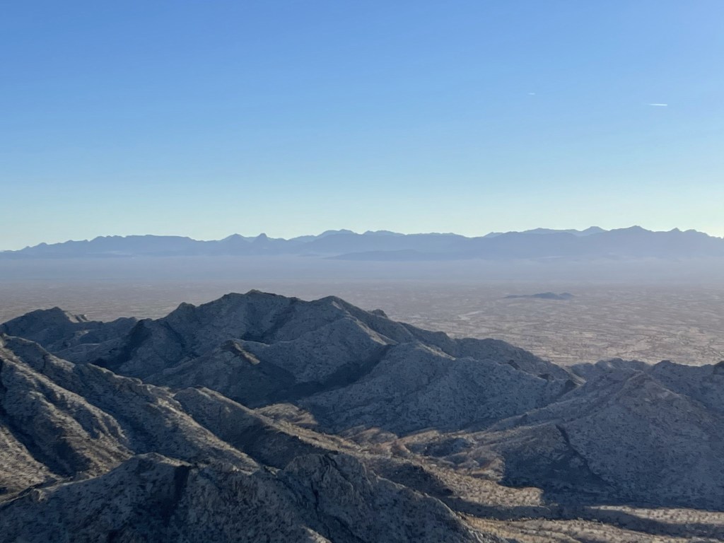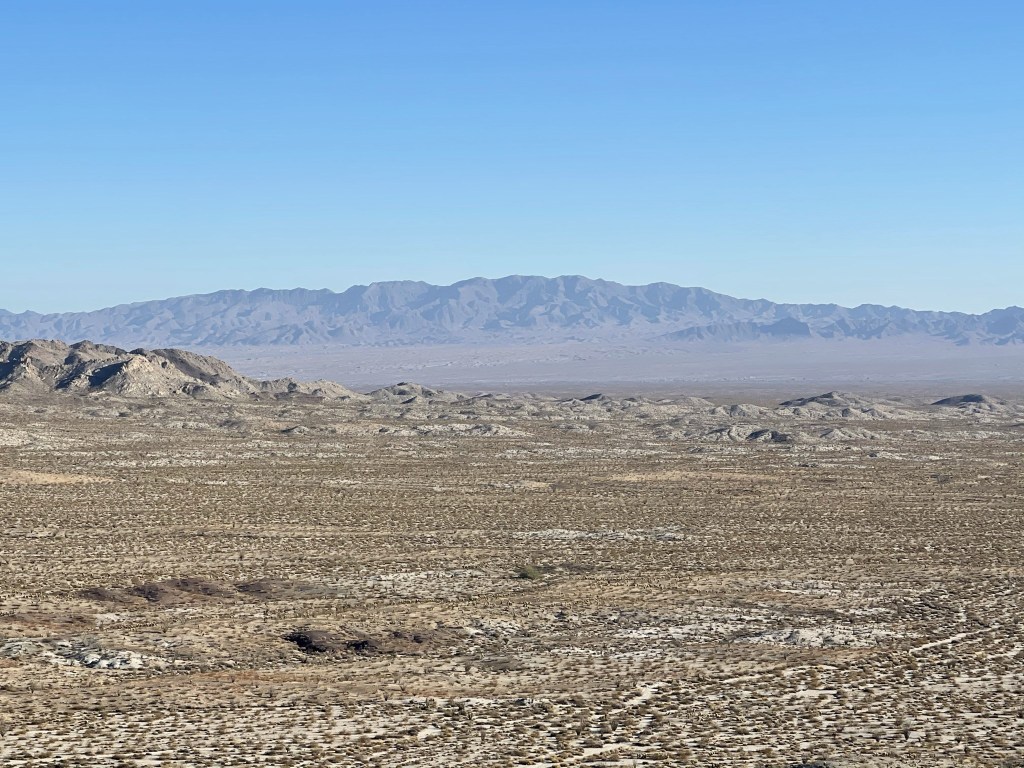 From the road, it’s actually difficult to tell that the Sawtooths are a separate range since they blend in with the Chemehuevi Mountains directly behind them. If you look closely at the below photo, you can tell there is a smaller range in the foreground with slightly different coloring. The tall peak in the background is DPS listed Chemehuevi Peak.