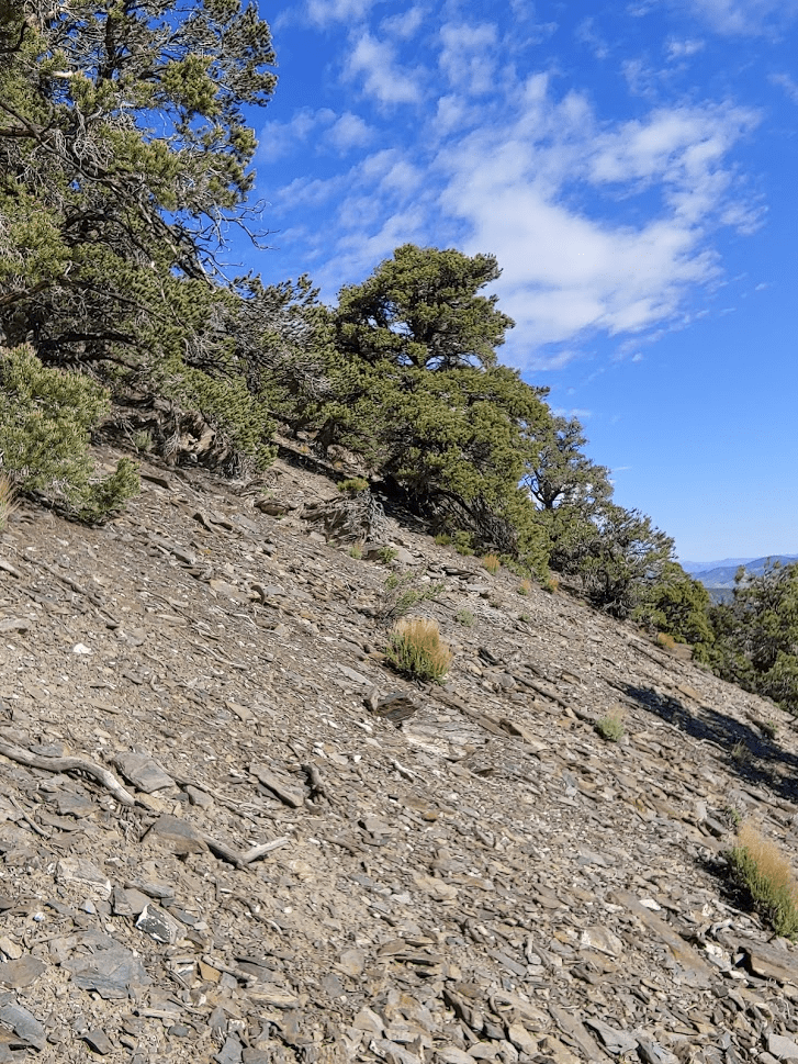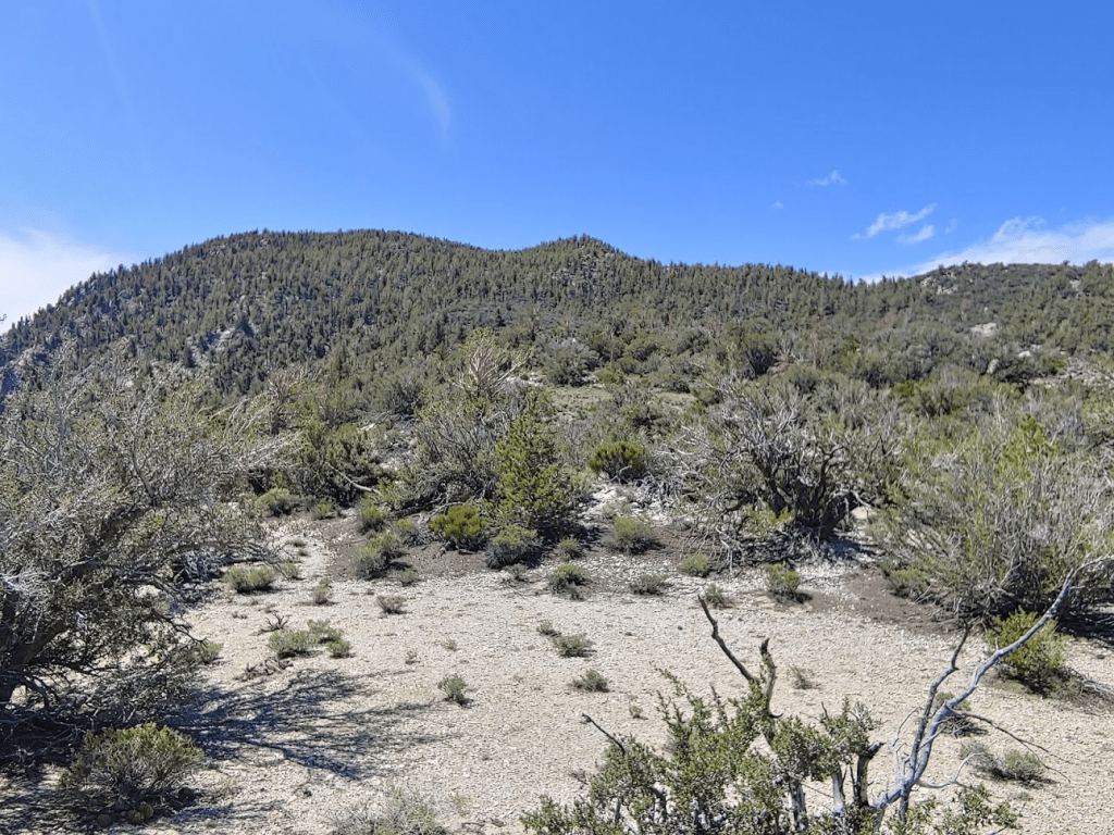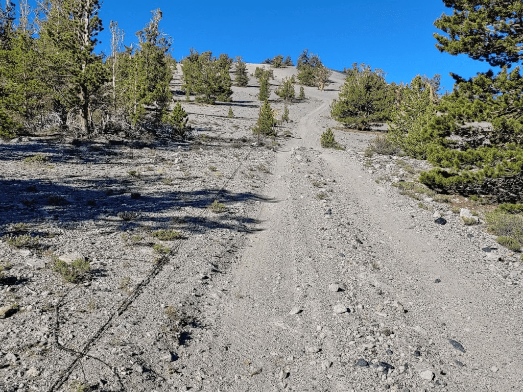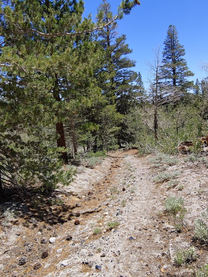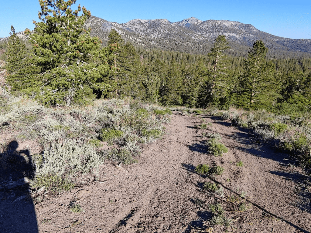 Once I reached Death Valley Road, I turned left and went 2 miles before turning left (south) onto Forest Road 9S15 (Hines Road on Google Maps). Zdon says to follow this road 5 miles up to a mine at 8800 feet. I made it 3 miles before reaching a rough spot where I decided to park. A small caravan of 3 jeeps came down the other way as I was parking. I chatted with the lead driver for a minute and he advised I didn’t go any farther in my Subaru. Good enough for me. I started hiking at 3:22pm from 7739 feet.
